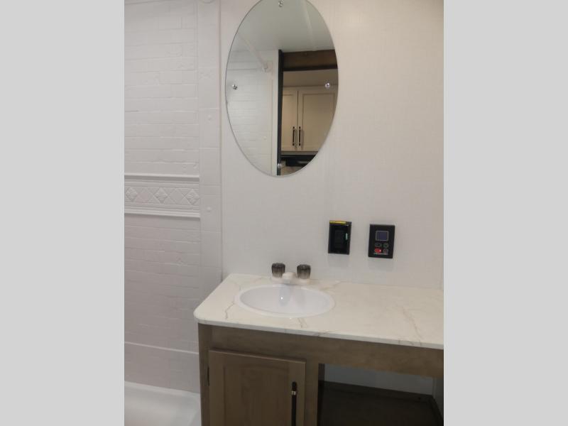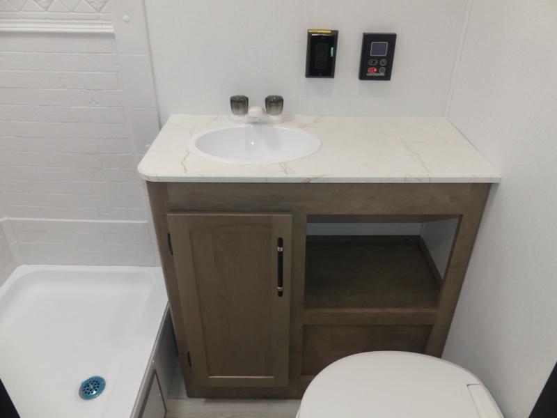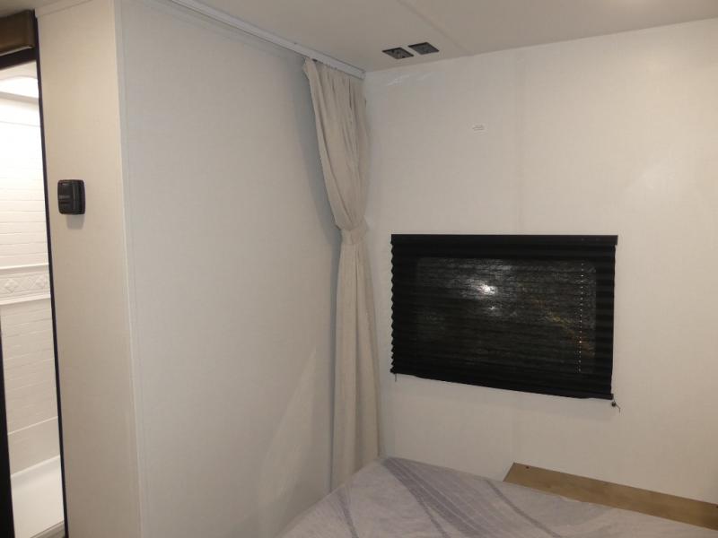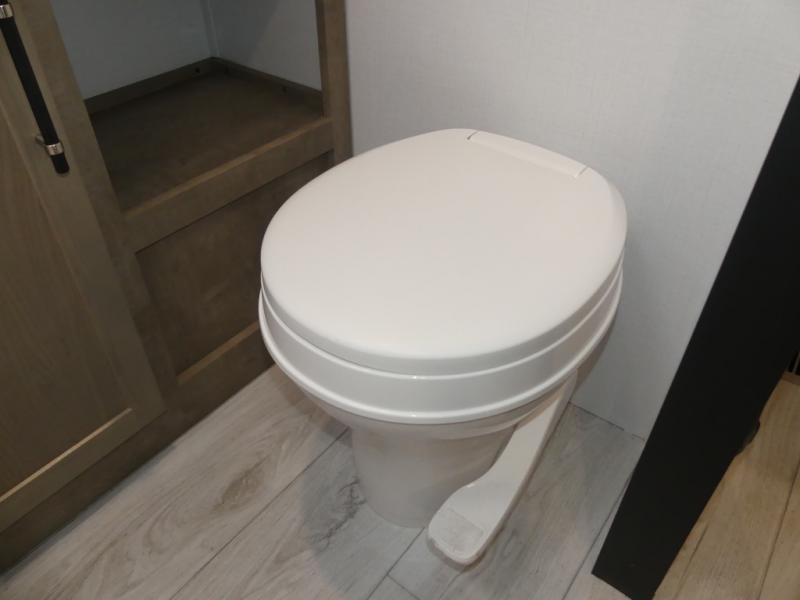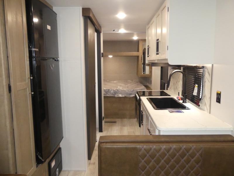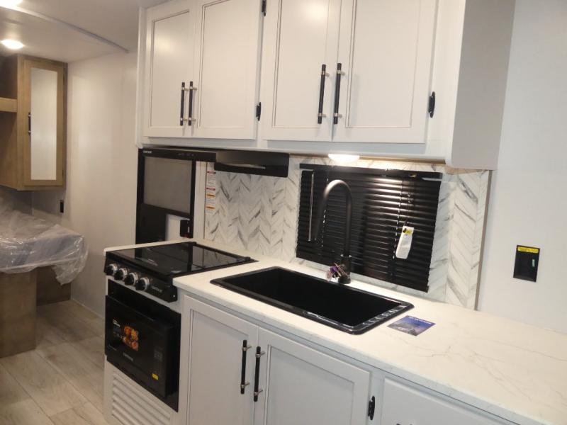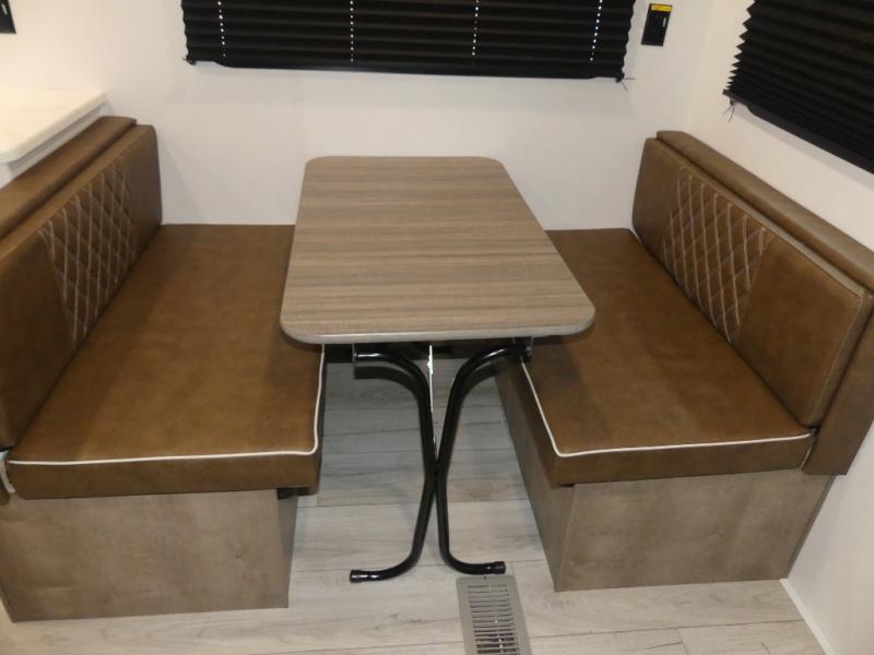 This trailer is perfect for your crew of four to six. There is a queen bed in the semi-private bedroom, along with dual closets and nightstands to keep your things tidy. You can dine each day on the booth dinette, relax on the sofa, and house additional guests here at night. The kitchen includes everything you need to prepare meals each day, including a gas range, microwave, and a 10 cu. ft. 12V refrigerator for cold items. And the full bath on board lets you stay clean throughout each camping trip!