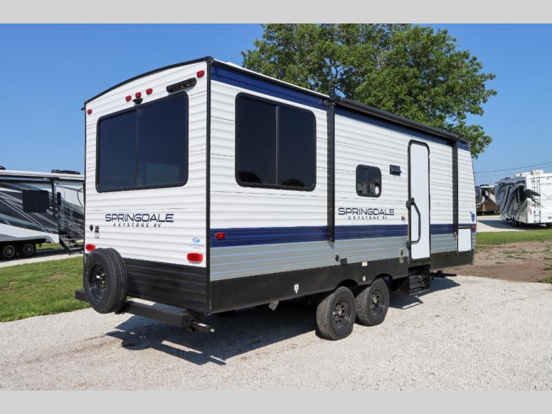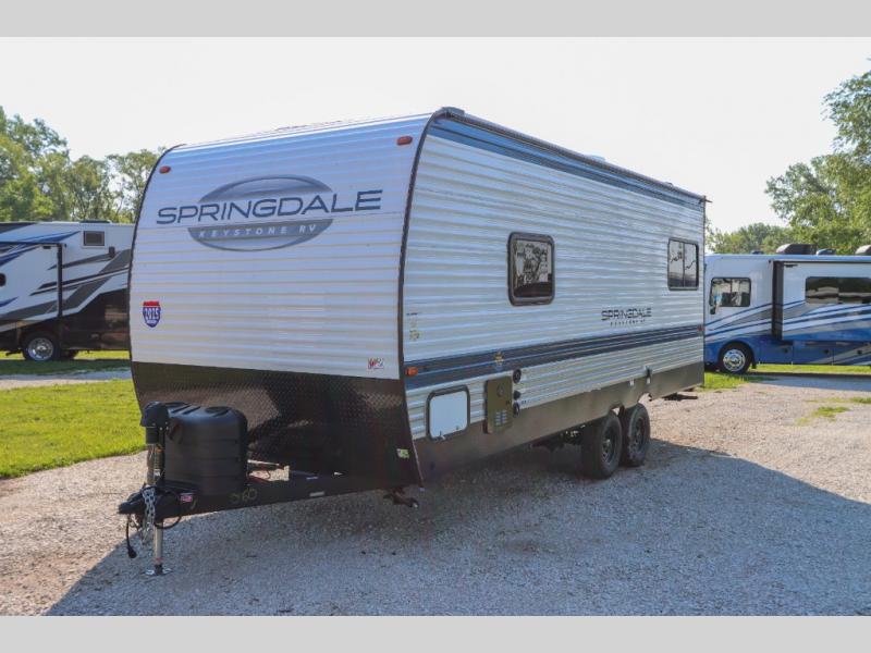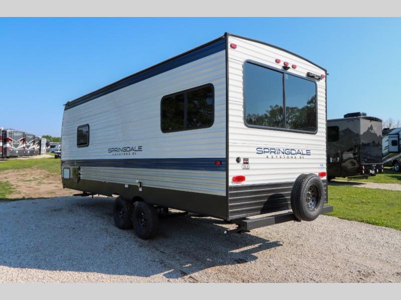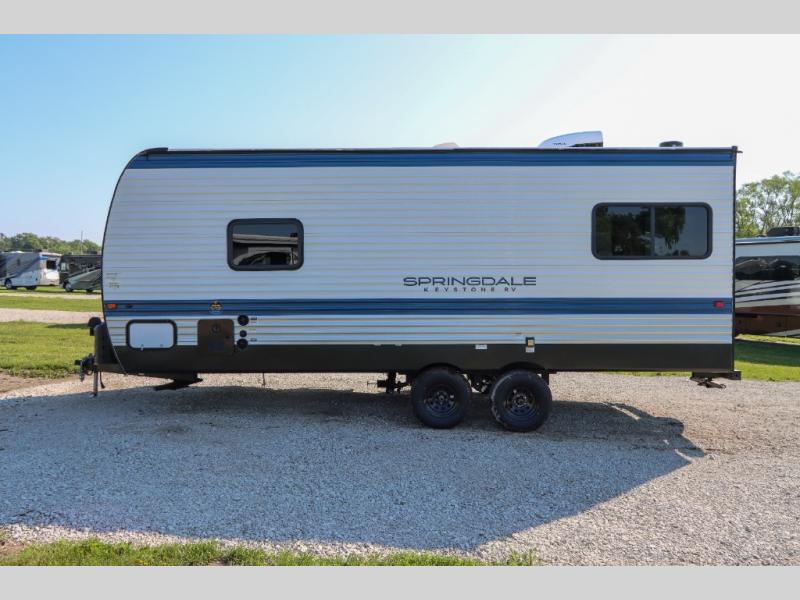 The Springdale Classic travel trailers by Keystone will provide you and your family many great outdoor experiences and it will also be kind to your pocketbook. Each one is constructed with an aluminum exterior, a walkable roof, and an I-beam frame with stamped steel cross-members and outriggers for added strength. There are also heavy duty stabilizer jacks and power tongue jacks outside, along with an XL entry assist handle for added convenience. Each travel trailer includes LED lighting, bedside outlets, and blackout night shades inside that will provide you with more privacy at night.