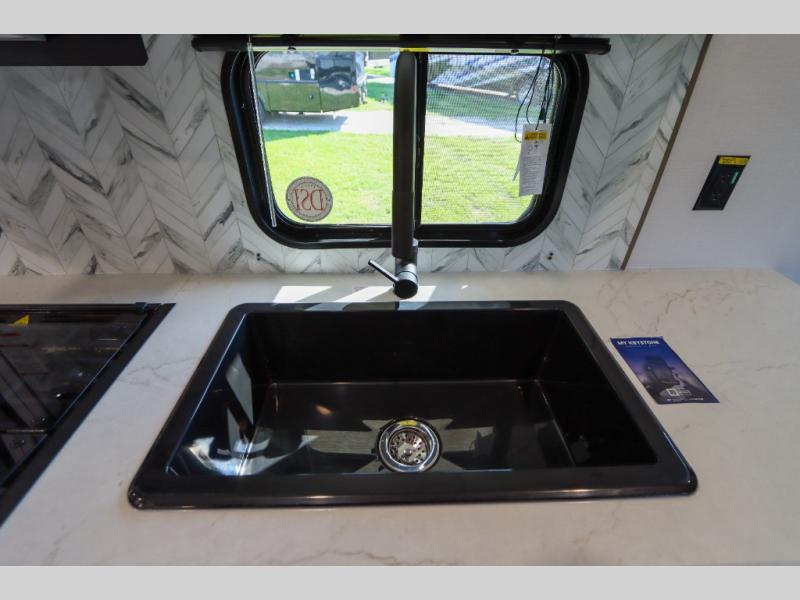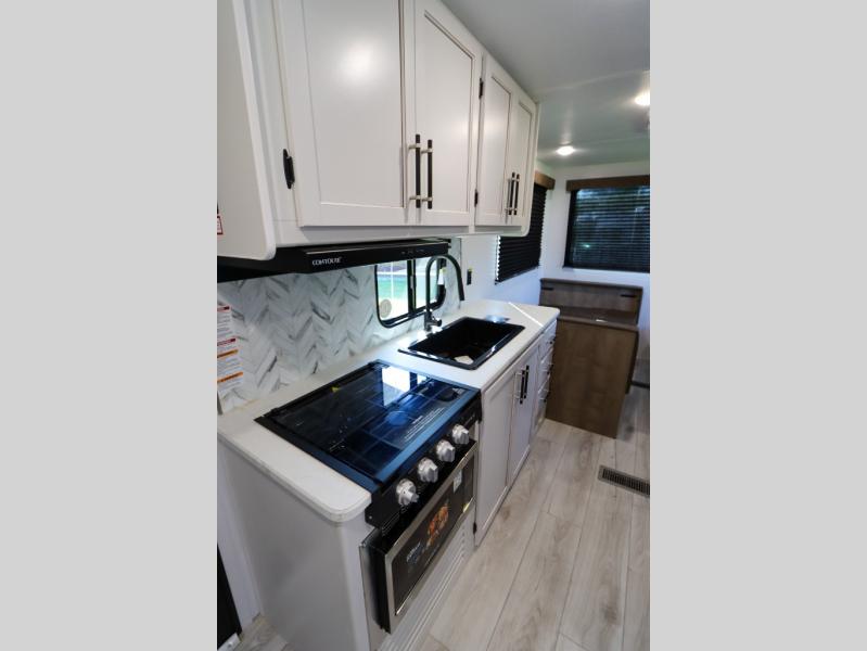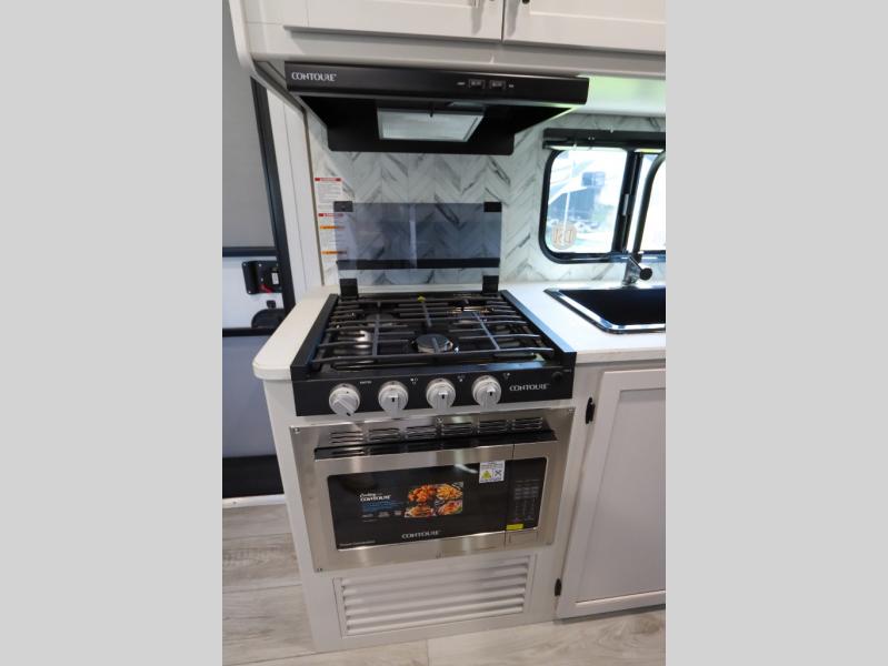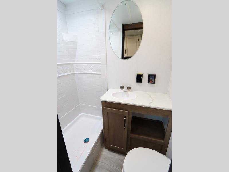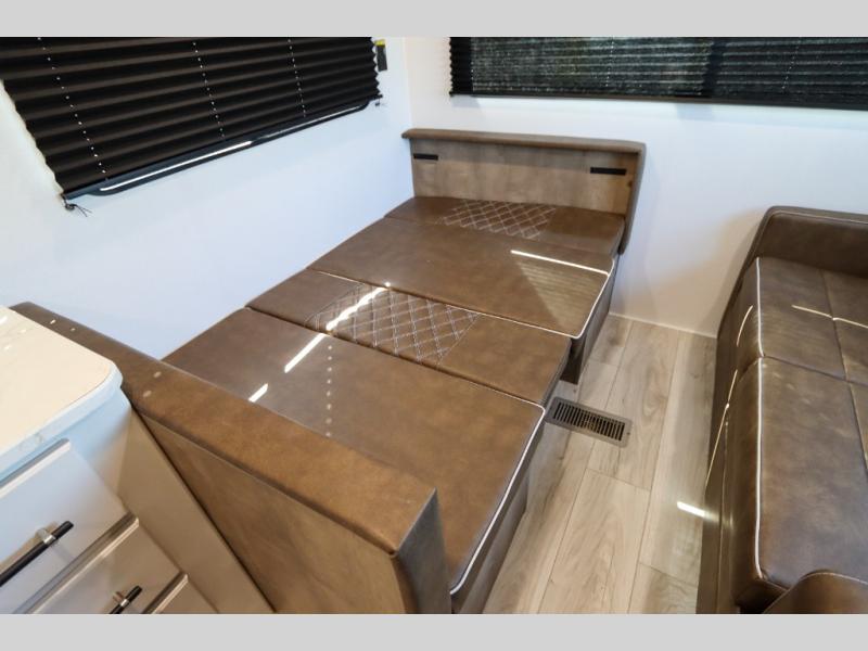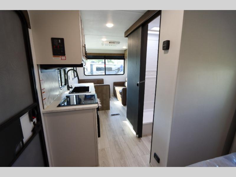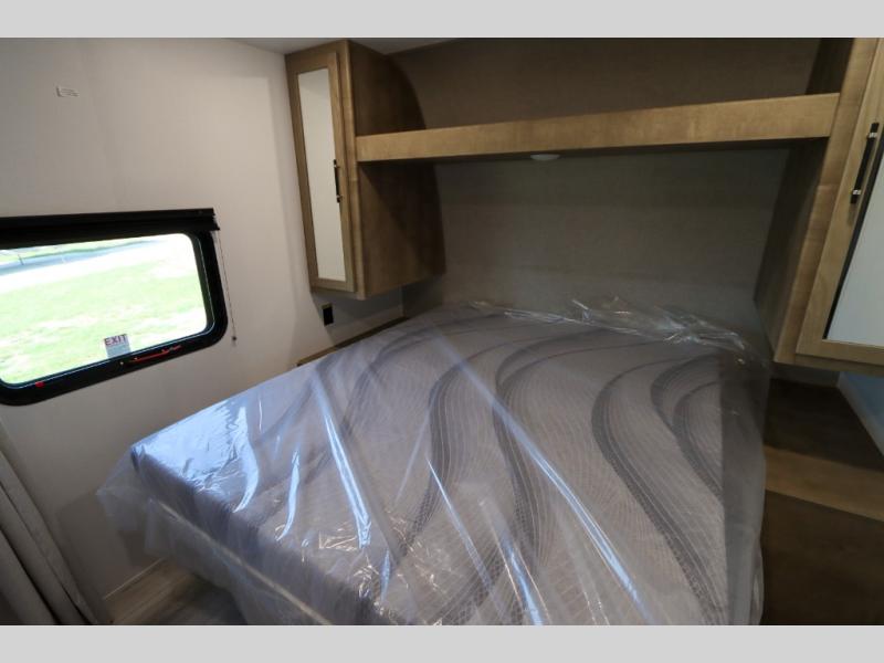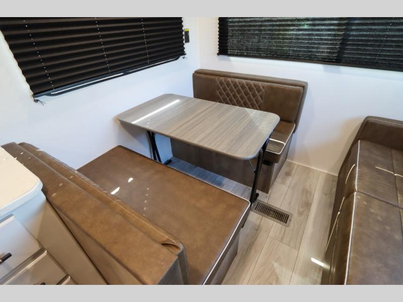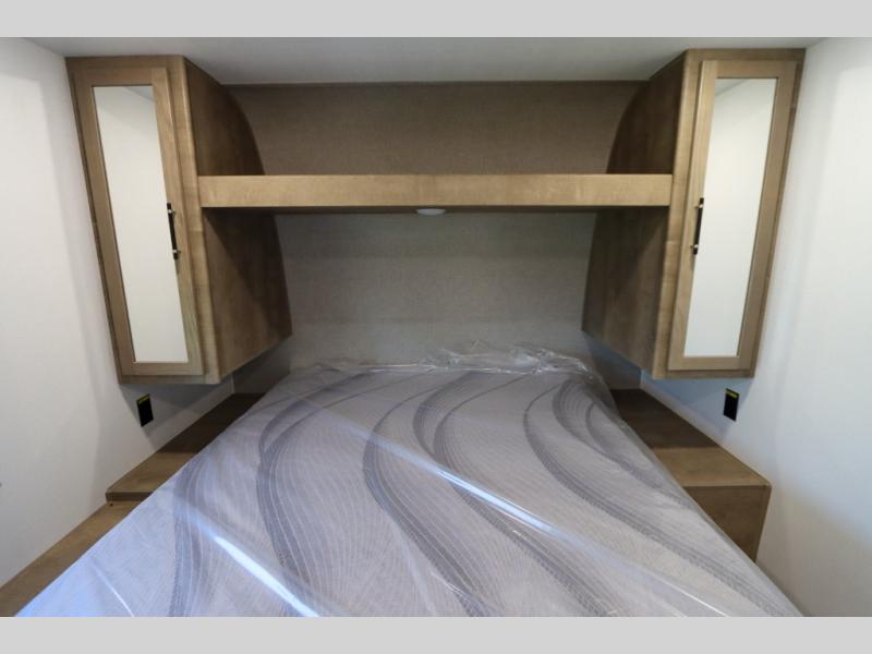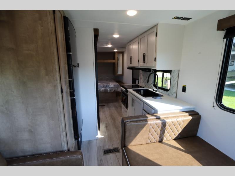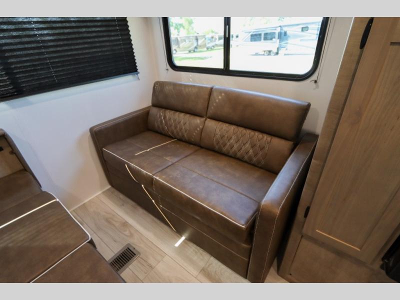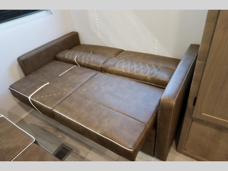 This trailer is perfect for your crew of four to six. There is a queen bed in the semi-private bedroom, along with dual closets and nightstands to keep your things tidy. You can dine each day on the booth dinette, relax on the sofa, and house additional guests here at night. The kitchen includes everything you need to prepare meals each day, including a gas range, microwave, and a 10 cu. ft. 12V refrigerator for cold items. And the full bath on board lets you stay clean throughout each camping trip!