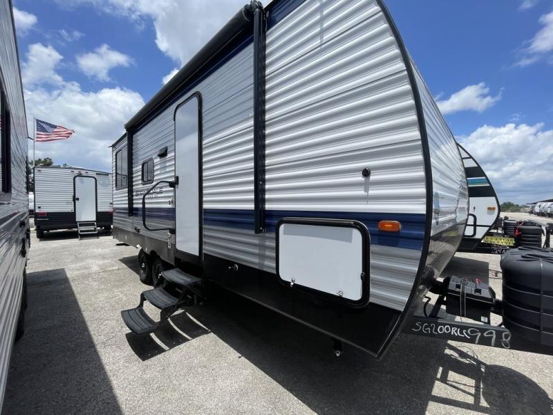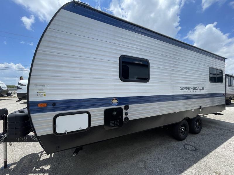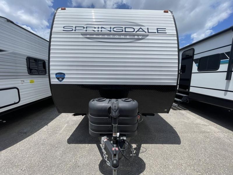 The Springdale Classic travel trailers by Keystone will provide you and your family many great outdoor experiences and it will also be kind to your pocketbook. Each one is constructed with an aluminum exterior, a walkable roof, and an I-beam frame with stamped steel cross-members and outriggers for added strength. There are also heavy duty stabilizer jacks and power tongue jacks outside, along with an XL entry assist handle for added convenience. Each travel trailer includes LED lighting, bedside outlets, and blackout night shades inside that will provide you with more privacy at night.
