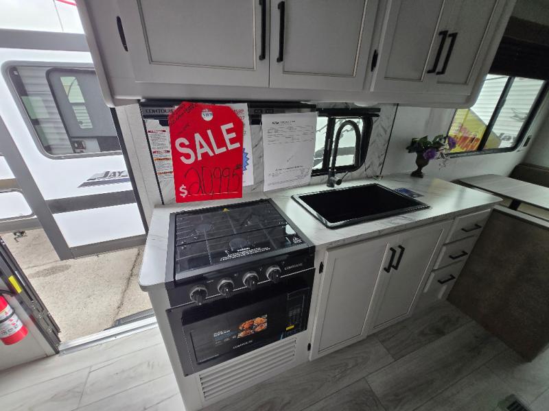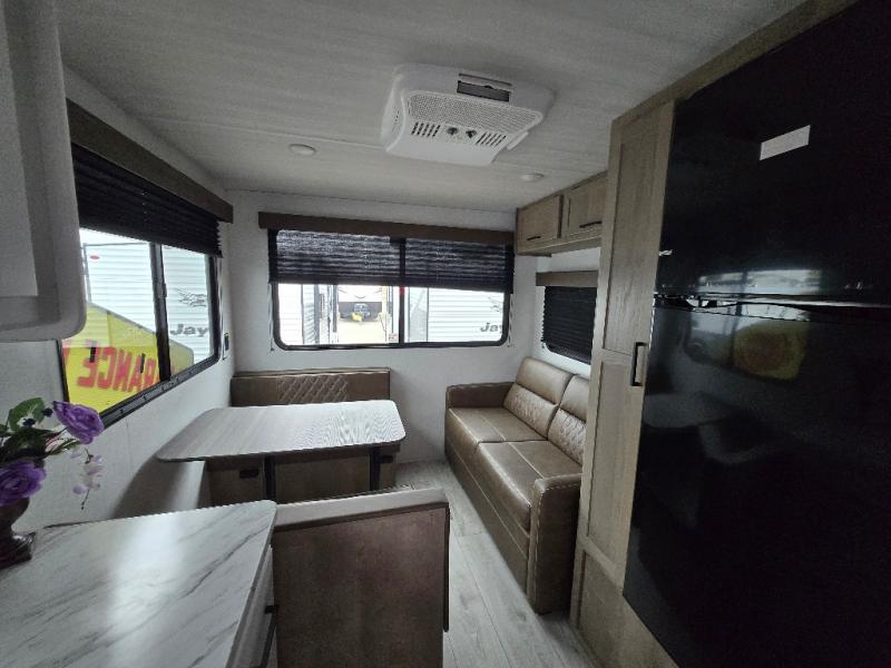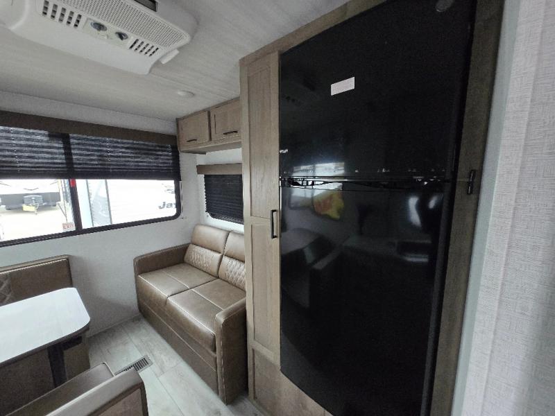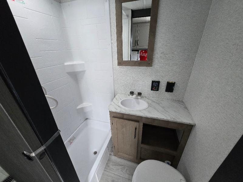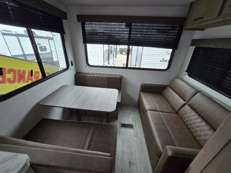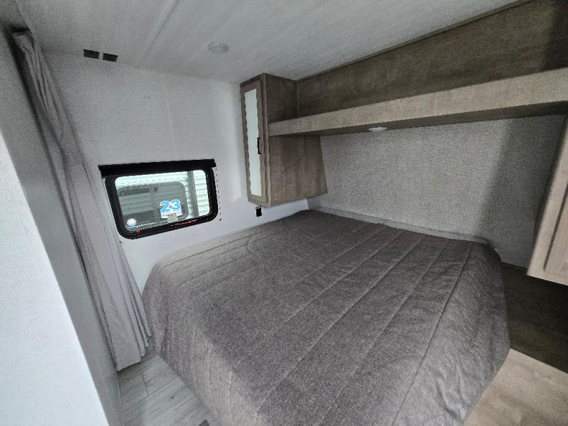This trailer is perfect for your crew of four to six. There is a queen bed in the semi-private bedroom, along with dual closets and nightstands to keep your things tidy. You can dine each day on the booth dinette, relax on the sofa, and house additional guests here at night. The kitchen includes everything you need to prepare meals each day, including a gas range, microwave, and a 10 cu. ft. 12V refrigerator for cold items. And the full bath on board lets you stay clean throughout each camping trip!