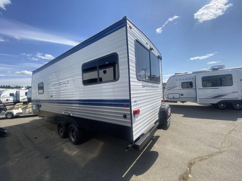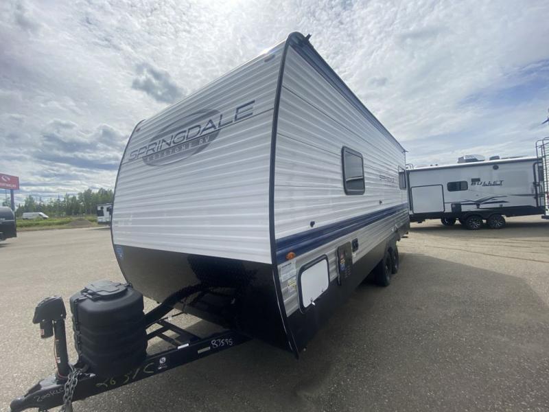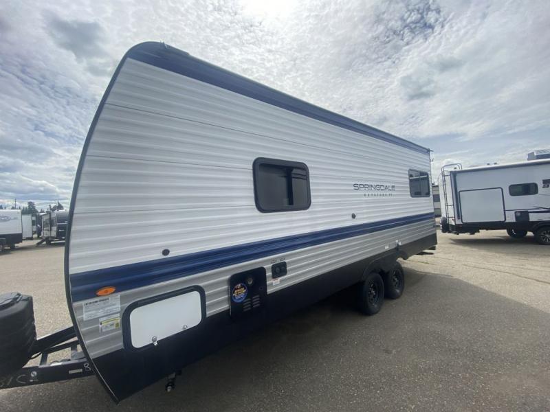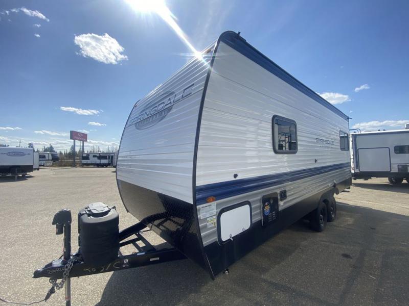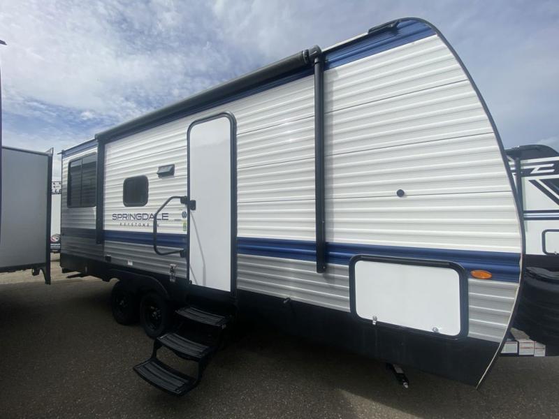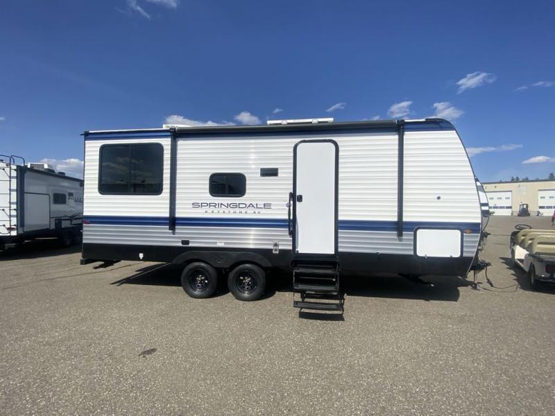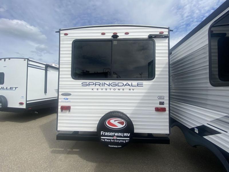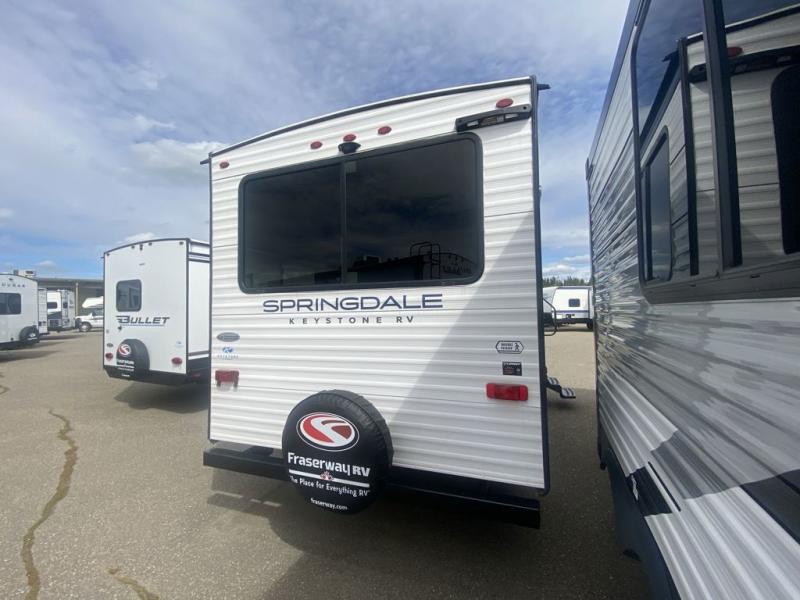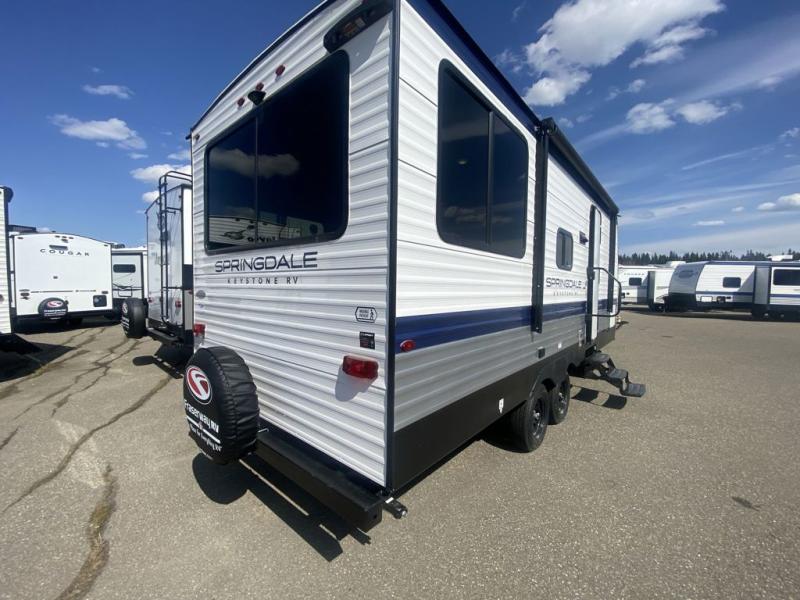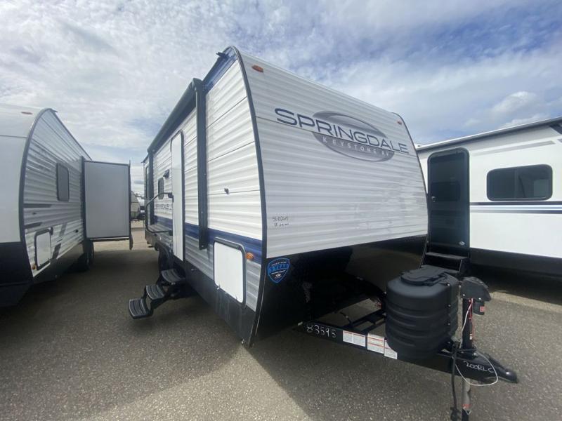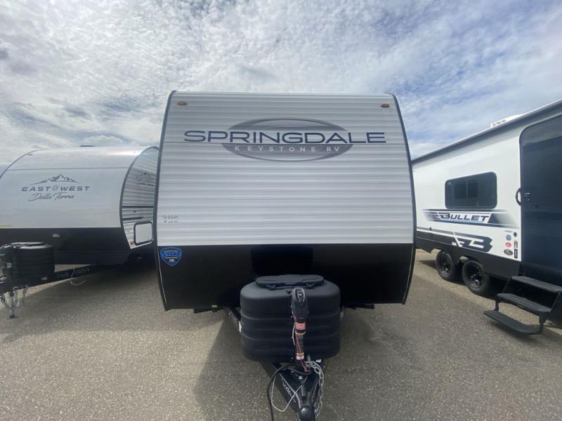 The Springdale Classic travel trailers by Keystone will provide you and your family many great outdoor experiences and it will also be kind to your pocketbook. Each one is constructed with an aluminum exterior, a walkable roof, and an I-beam frame with stamped steel cross-members and outriggers for added strength. There are also electric stabilizer jacks and power tongue jacks outside, along with a friction hinge entry door and an XL entry assist handle for added convenience. Each travel trailer includes a two burner flush mount gas range with a glass cover, LED lighting, bedside outlets, and blackout night shades inside that will provide you with more privacy at night.