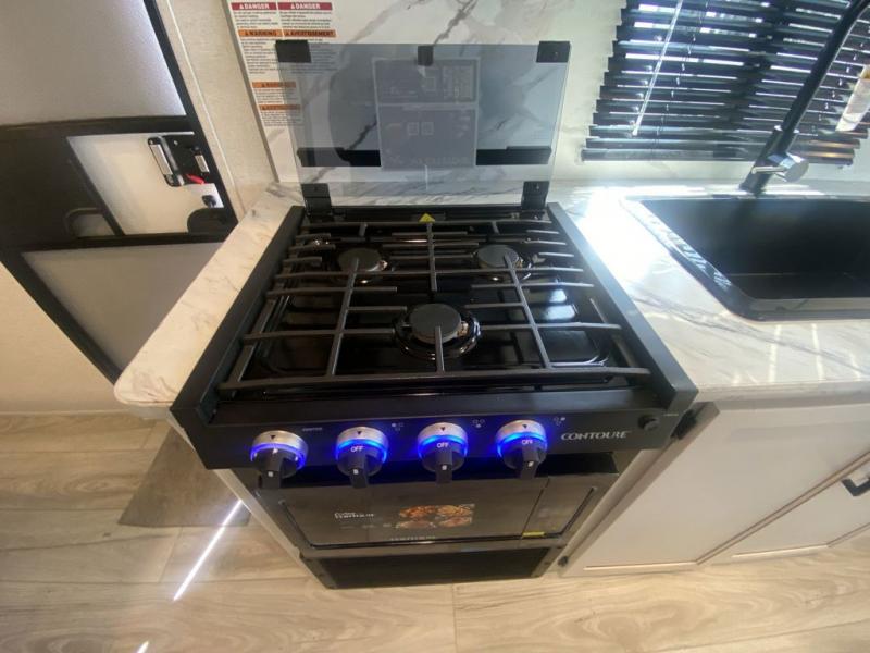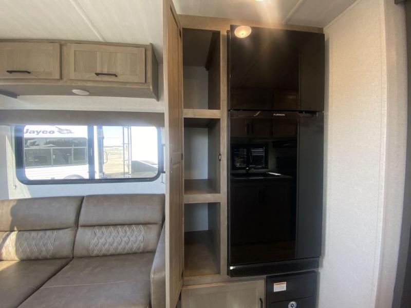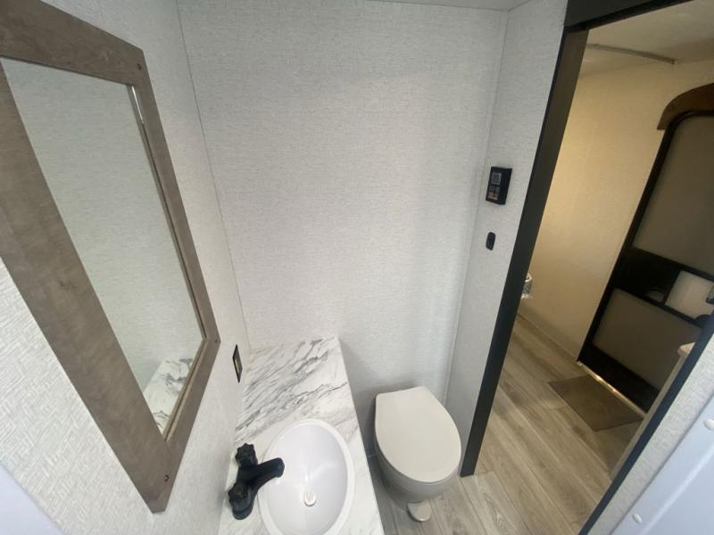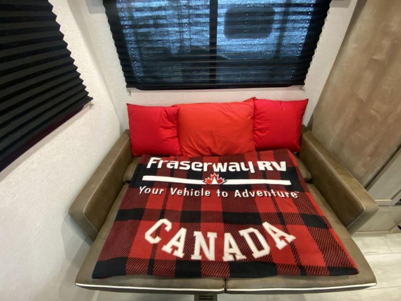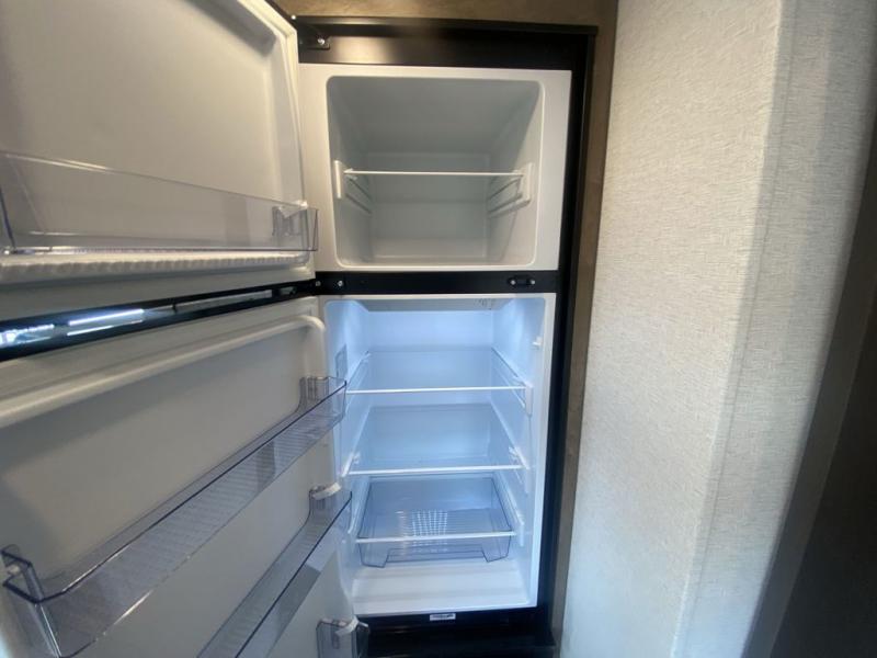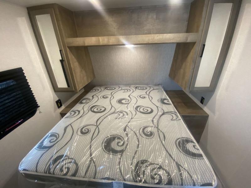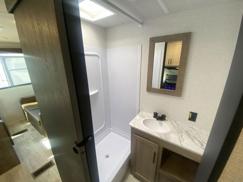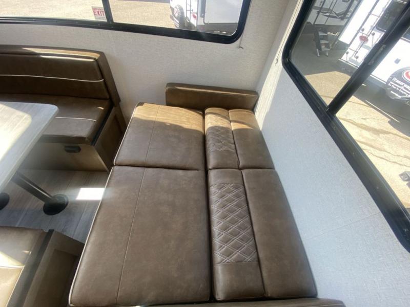 This trailer is perfect for your crew of four to six. There is a queen bed in the semi-private bedroom, along with dual closets and nightstands to keep your things tidy. You can dine each day on the booth dinette, relax on the sofa, and house additional guests here at night. The kitchen includes everything you need to prepare meals each day, including a gas range, microwave, and a 10 cu. ft. 12V refrigerator for cold items. And the full bath on board lets you stay clean throughout each camping trip!
