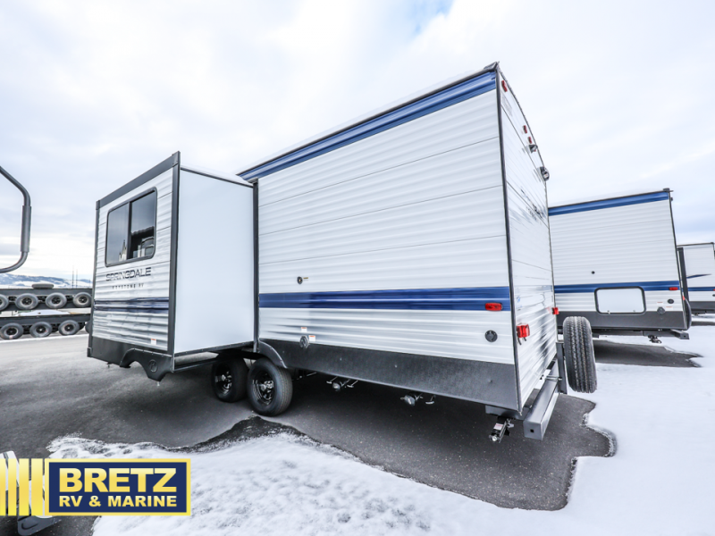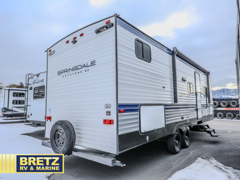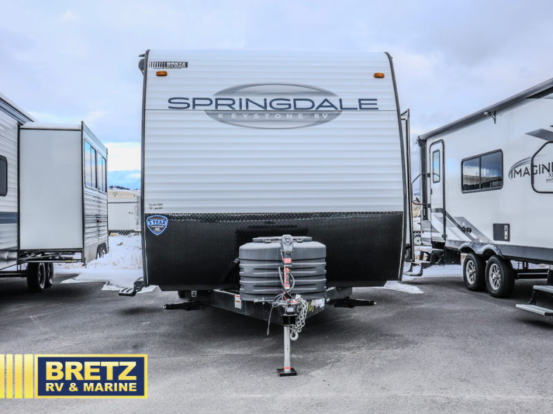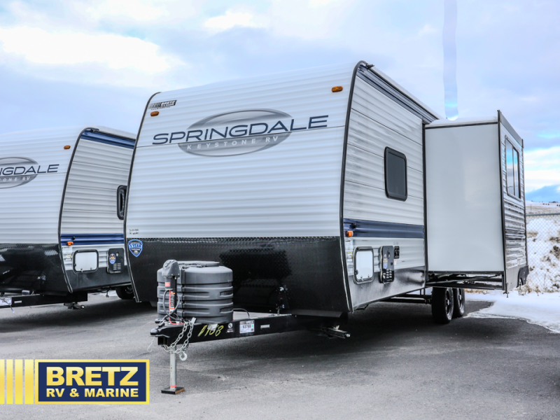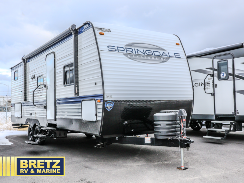 The Springdale Classic travel trailers by Keystone will provide you and your family many great outdoor experiences and it will also be kind to your pocketbook. Each one is constructed with an aluminum exterior, a walkable roof, and an I-beam frame with stamped steel cross-members and outriggers for added strength. There are also electric stabilizer jacks and power tongue jacks outside, along with a friction hinge entry door and an XL entry assist handle for added convenience. Each travel trailer includes a two burner flush mount gas range with a glass cover, LED lighting, bedside outlets, and blackout night shades inside that will provide you with more privacy at night. Some of the Keystone Exclusives you'll appreciate are the color-coded unified wiring and in-floor heating ducts, and the optional SolarFlex 200 will let you add off-grid capabilities if you choose!