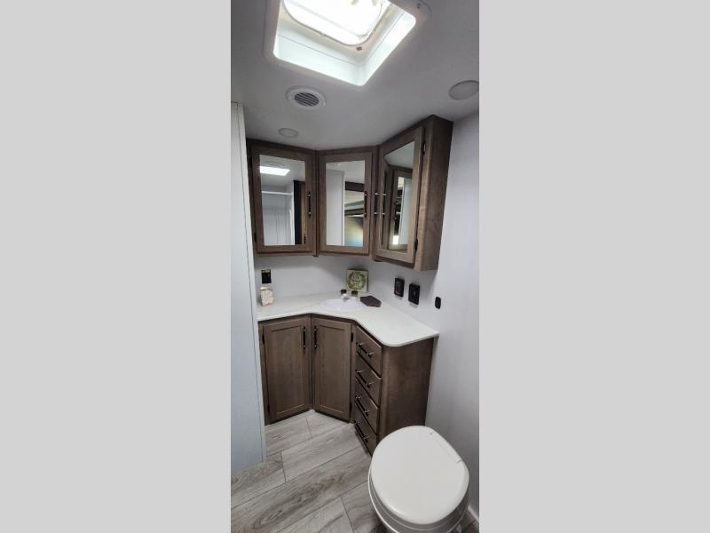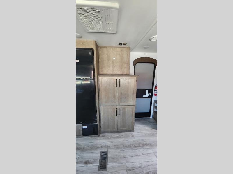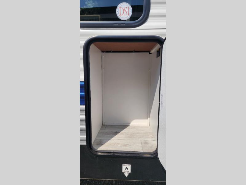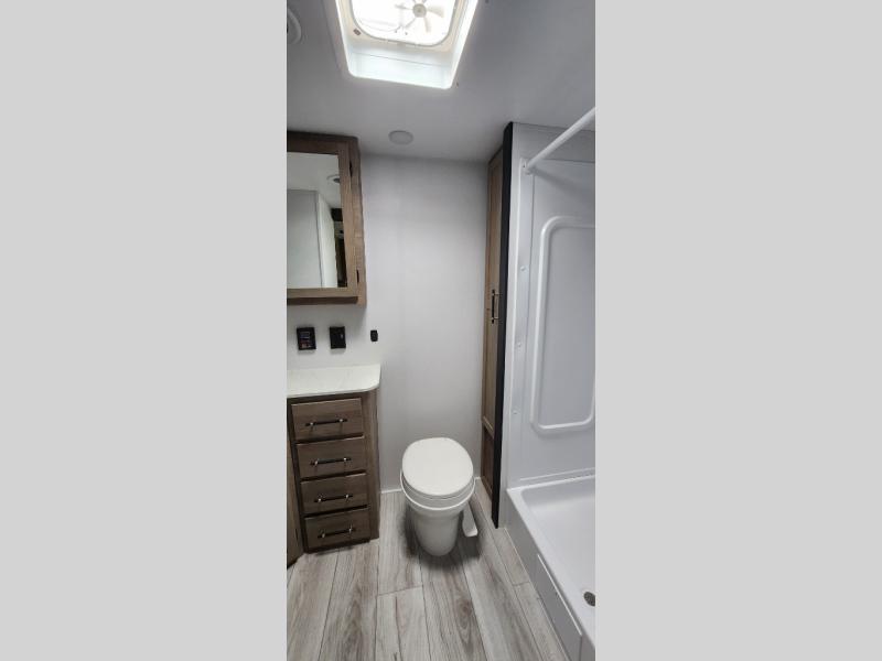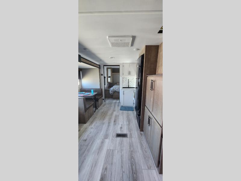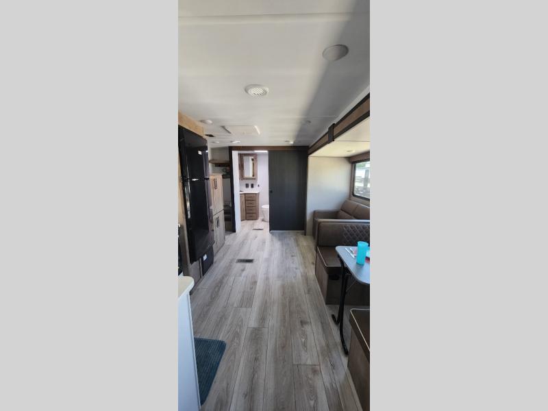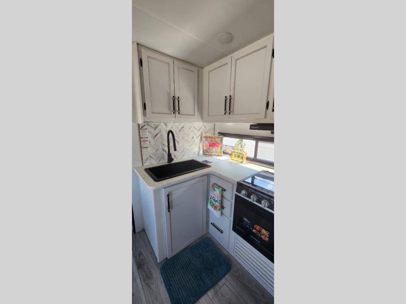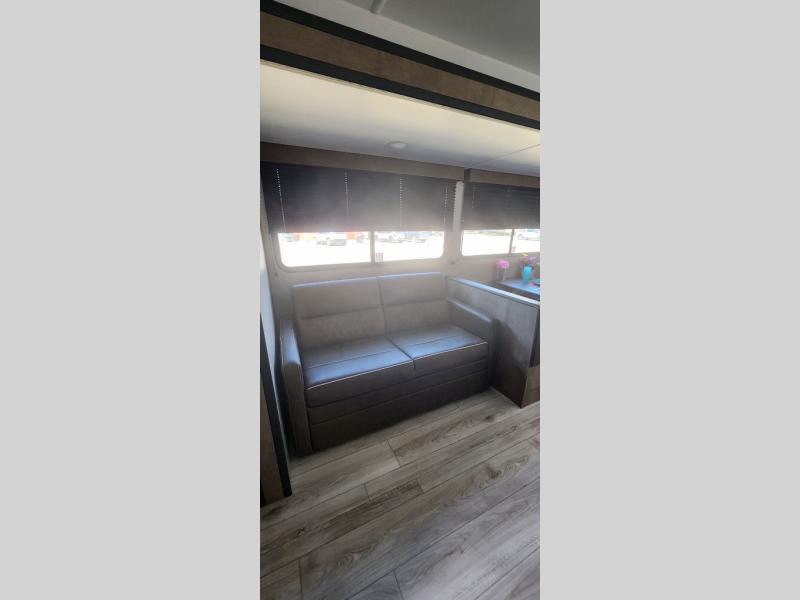 You'll feel right at home wherever you decide to camp in this travel trailer. The large slide out in the combined kitchen and living area gives your crew plenty of space to move about, plus there is a booth dinette and sofa for comfy seating and sleeping spaces. A full kitchen, compete with three burner cooktop and 10 cu. ft. 12V refrigerator will let you cook and store food for the whole week. Head to the full rear bath that includes a spacious vanity, a shower, toilet, and linen closet for clean towels. And when you're ready to catch some zzz's, the queen bed in the front private bedroom is sure to bring comfort!
