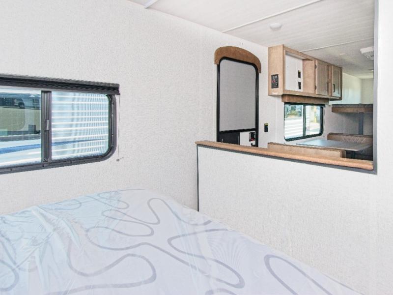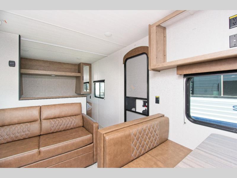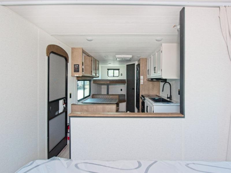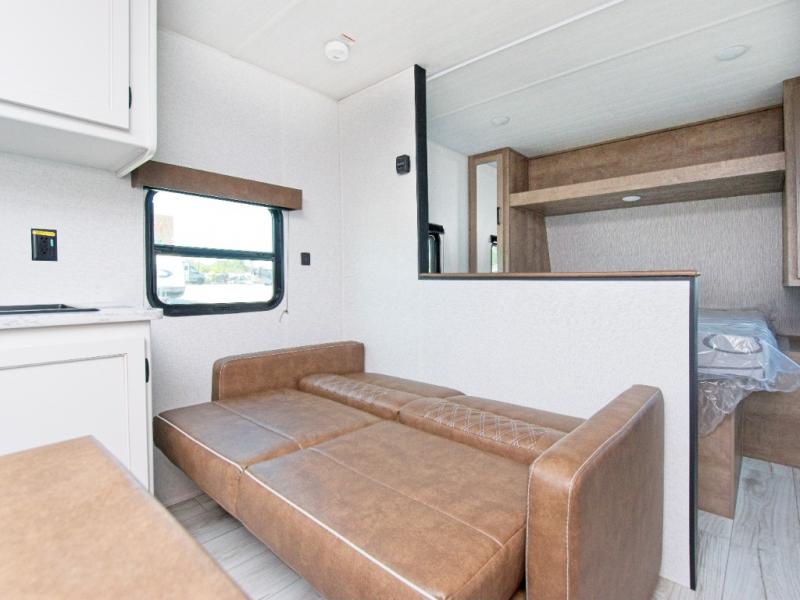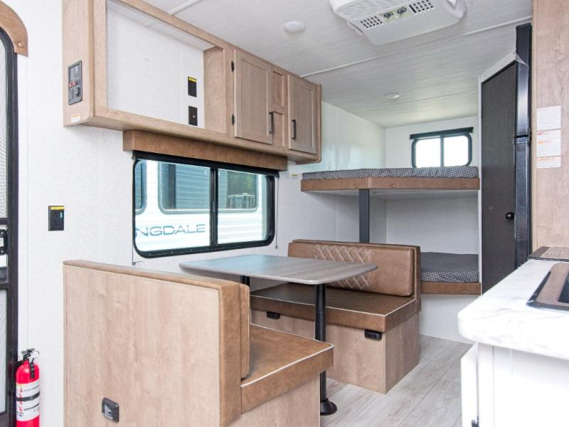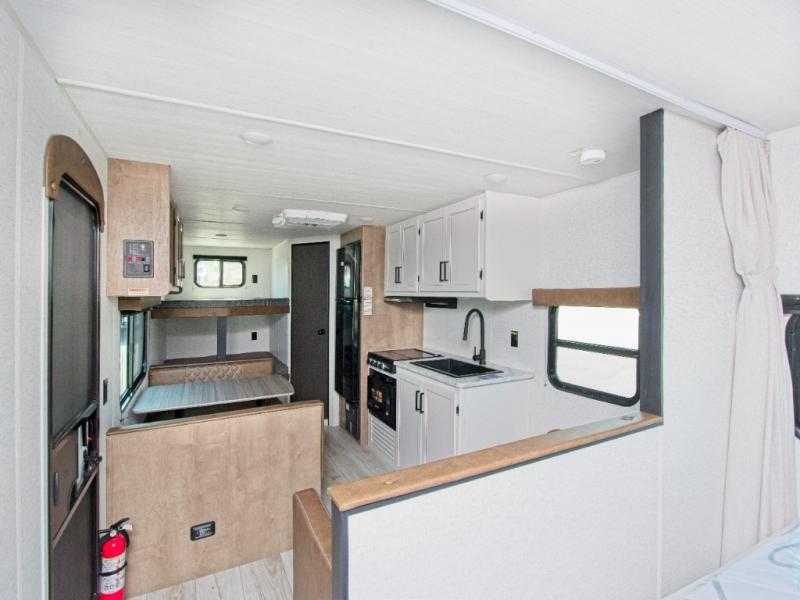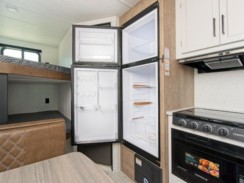 Step inside and you’ll find a welcoming open floorplan with a booth dinette and sofa that easily convert to extra sleeping space. The private front bedroom features a queen bed for a restful night’s sleep, while the rear double-over-double bunks offer plenty of room for kids or guests. The fully equipped kitchen includes a residential-style refrigerator, microwave, and generous counter space, so you can cook your favorite meals on the road. The bathroom is conveniently located near the bunks and offers a shower with a skylight and foot-flush toilet for easy use.