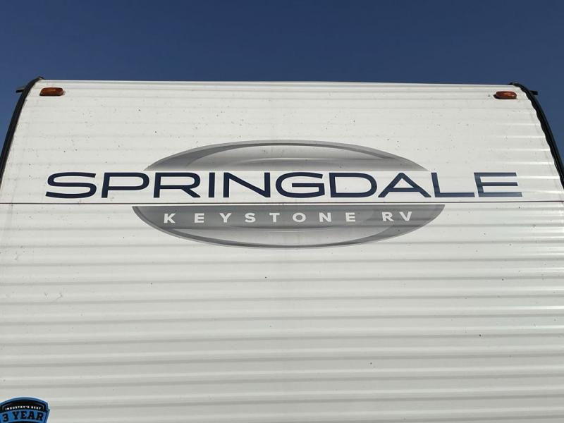 The Springdale Classic travel trailers by Keystone will provide you and your family many great outdoor experiences and it will also be kind to your pocketbook. Each one is constructed with an aluminum exterior, a walkable roof, and an I-beam frame with stamped steel cross-members and outriggers for added strength. There are also electric stabilizer jacks and power tongue jacks outside, along with a friction hinge entry door and an XL entry assist handle for added convenience. Each travel trailer includes a two burner flush mount gas range with a glass cover, LED lighting, bedside outlets, and blackout night shades inside that will provide you with more privacy at night. Some of the Keystone Exclusives you'll appreciate are the color-coded unified wiring and in-floor heating ducts, and the optional SolarFlex 200 will let you add off-grid capabilities if you choose!