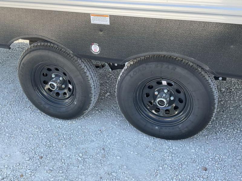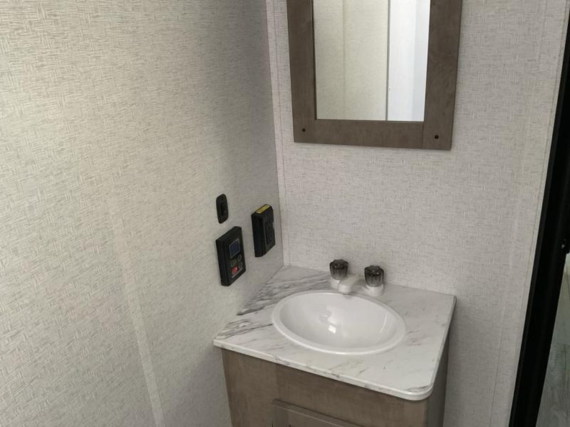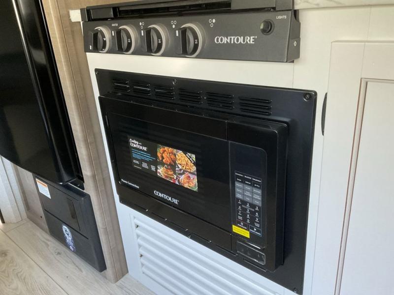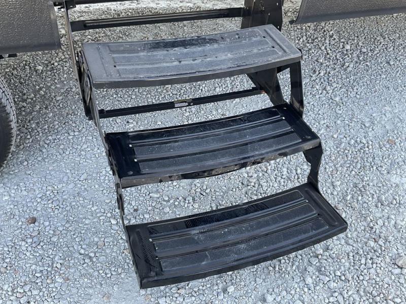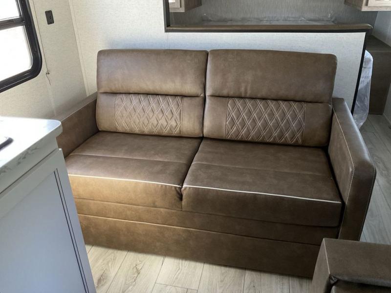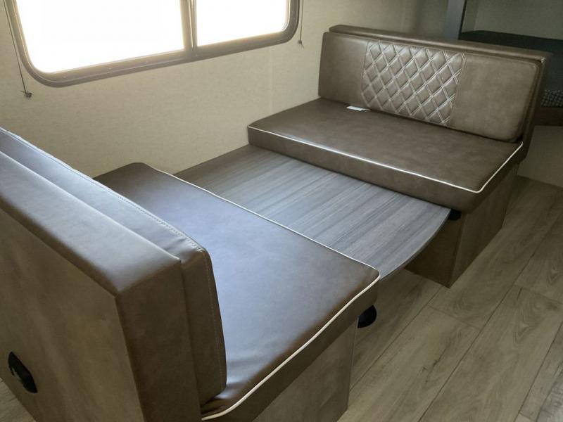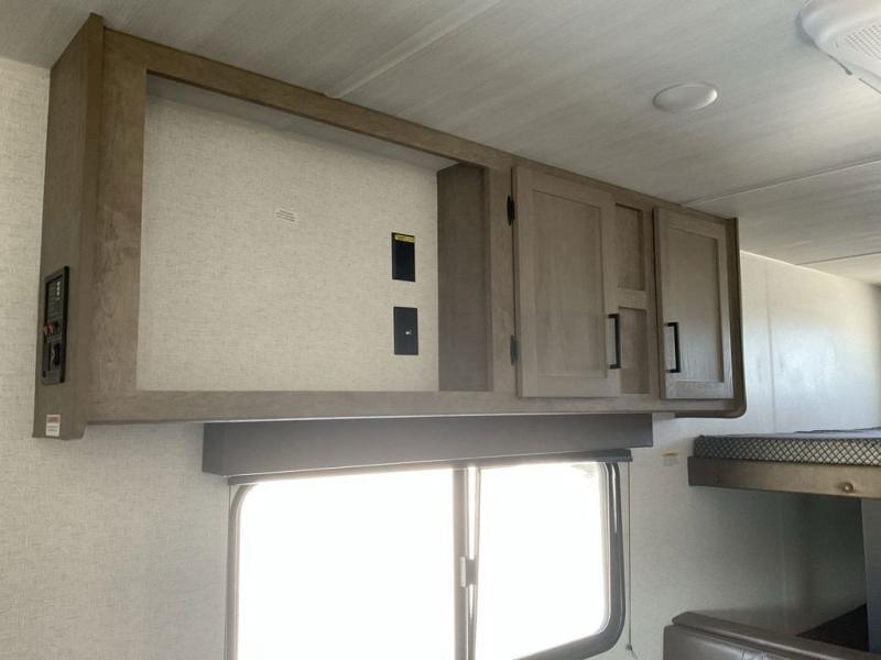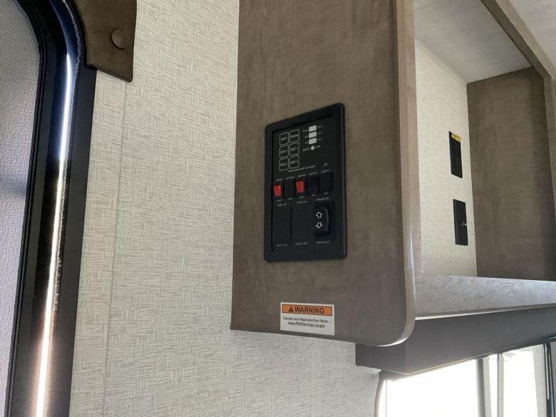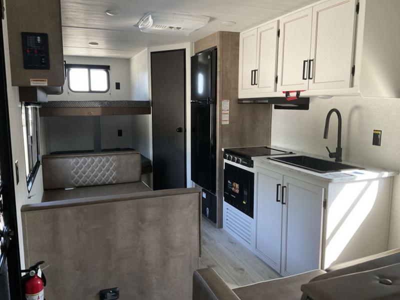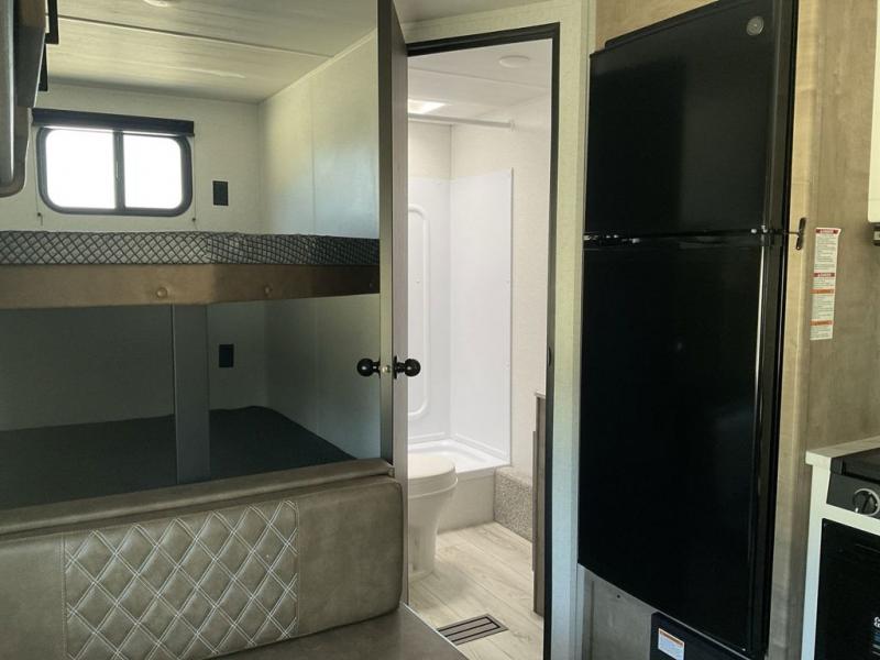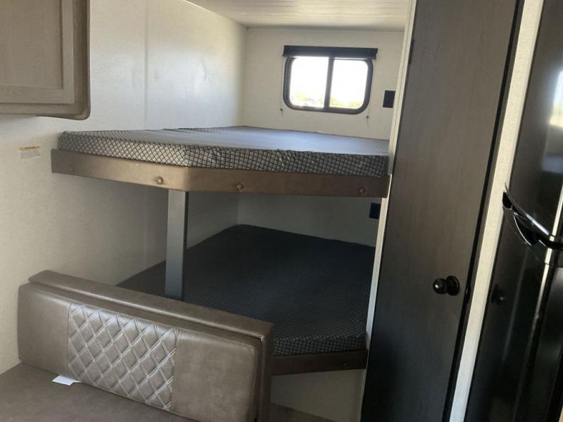 Bring the whole gang and explore with this bunkhouse travel trailer in tow! There is sleeping for up to 10 with double-size bunk beds, a queen bed up front, as well as a sofa and booth dinette that can accommodate more when reconfigured at night. You will easily be able to create meals to enjoy while camping inside with the three-burner range and a 10 cu. ft. 12V refrigerator. Overhead storage is available above the stove and sink and along the opposite side. There is also a front pass-through for housing all of your outdoor gear, as well as additional outside storage beneath the bunk beds. The 12' power awning will also provide more living space and outdoor protection from the sun and/or rain.