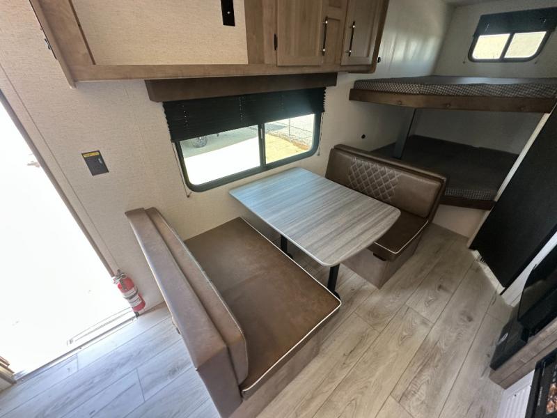 Bring the whole gang and explore with this bunkhouse travel trailer in tow! There is sleeping for up to 10 with double-size bunk beds, a queen bed up front, as well as a sofa and booth dinette that can accommodate more when reconfigured at night. You will easily be able to create meals to enjoy while camping inside with the three-burner range and a 10 cu. ft. 12V refrigerator. Overhead storage is available above the stove and sink and along the opposite side. There is also a front pass-through for housing all of your outdoor gear, as well as additional outside storage beneath the bunk beds. The 12' power awning will also provide more living space and outdoor protection from the sun and/or rain.