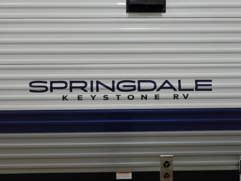 The Springdale Classic travel trailers by Keystone will provide you and your family many great outdoor experiences and it will also be kind to your pocketbook. Each one is constructed with an aluminum exterior, a walkable roof, and an I-beam frame with stamped steel cross-members and outriggers for added strength. There are also electric stabilizer jacks and power tongue jacks outside, along with a friction hinge entry door and an XL entry assist handle for added convenience. Each travel trailer includes a two burner flush mount gas range with a glass cover, LED lighting, bedside outlets, and blackout night shades inside that will provide you with more privacy at night.