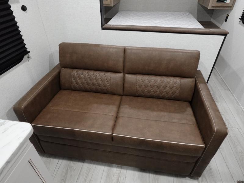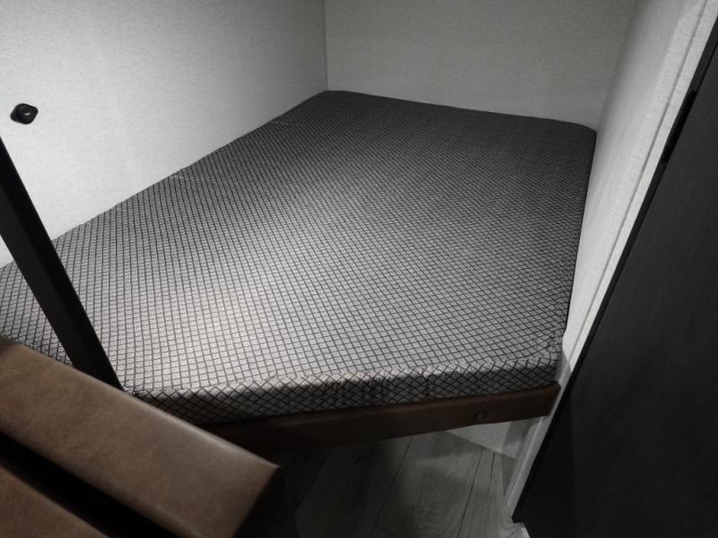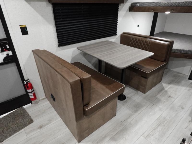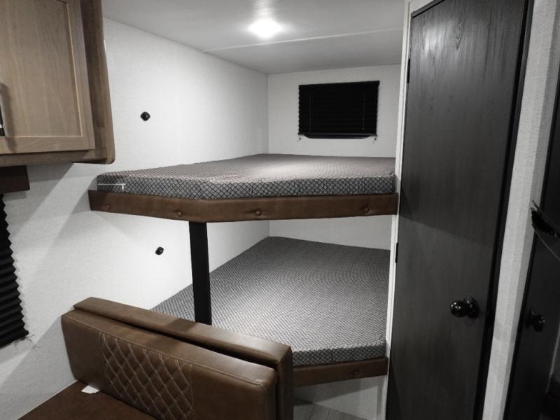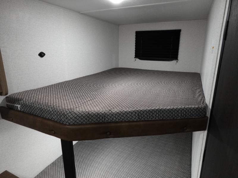 Bring the whole gang and explore with this bunkhouse travel trailer in tow! There is sleeping for up to 10 with double-size bunk beds, a queen bed up front, as well as a sofa and booth dinette that can accommodate more when reconfigured at night. You will easily be able to create meals to enjoy while camping inside with the three-burner range and a 10 cu. ft. 12V refrigerator. Overhead storage is available above the stove and sink and along the opposite side. There is also a front pass-through for housing all of your outdoor gear, as well as additional outside storage beneath the bunk beds. The 12' power awning will also provide more living space and outdoor protection from the sun and/or rain.