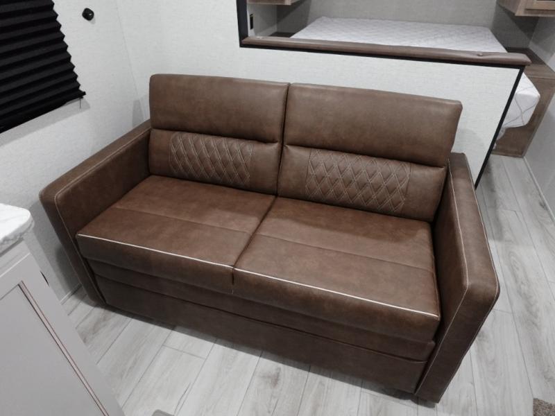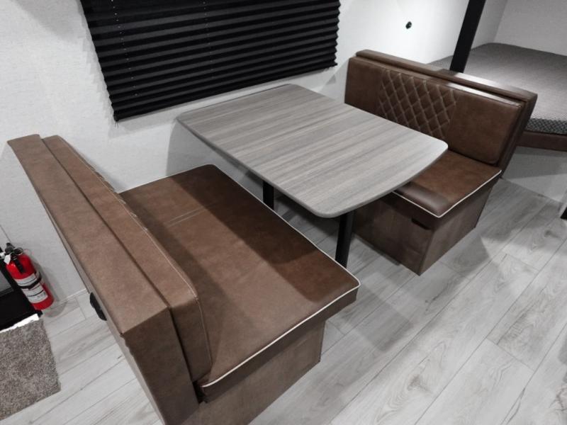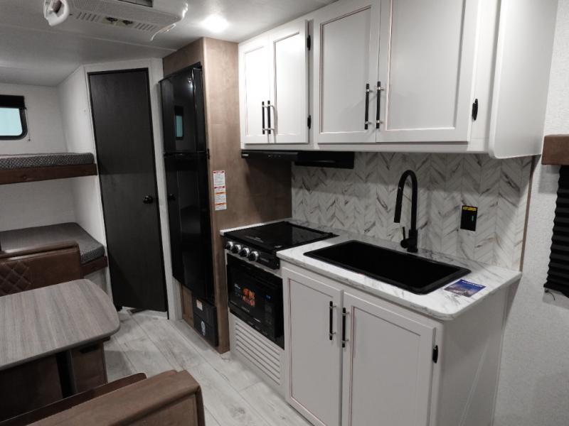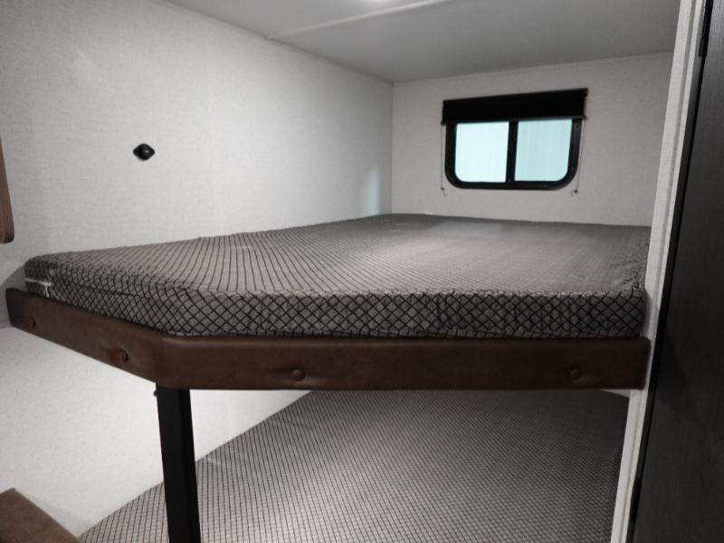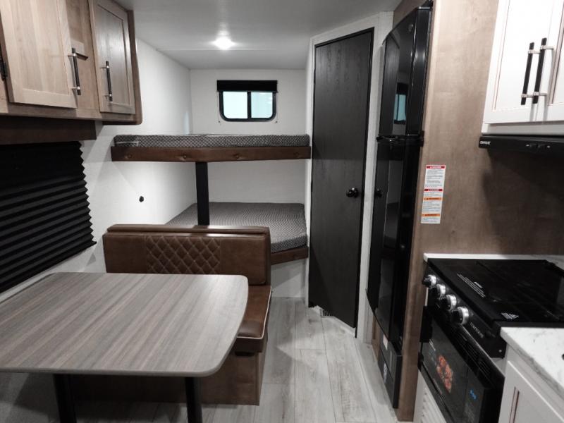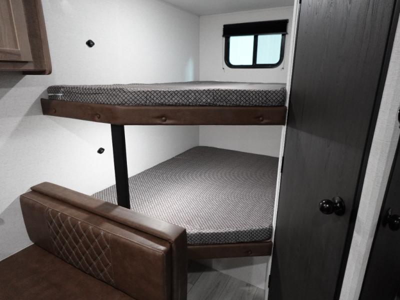 Bring the whole gang and explore with this bunkhouse travel trailer in tow! There is sleeping for up to 10 with double-size bunk beds, a queen bed up front, as well as a sofa and booth dinette that can accommodate more when reconfigured at night. You will easily be able to create meals to enjoy while camping inside with the three-burner range and a 10 cu. ft. 12V refrigerator. Overhead storage is available above the stove and sink and along the opposite side. There is also a front pass-through for housing all of your outdoor gear, as well as additional outside storage beneath the bunk beds. The 12' power awning will also provide more living space and outdoor protection from the sun and/or rain.