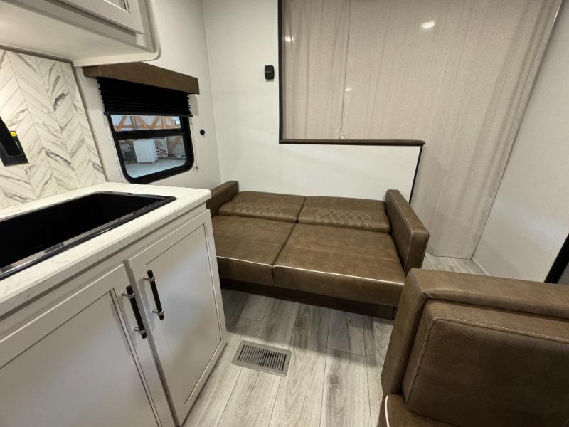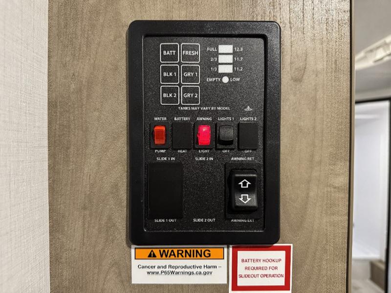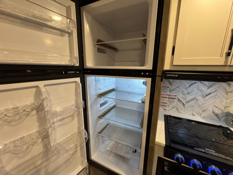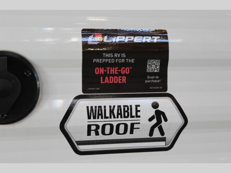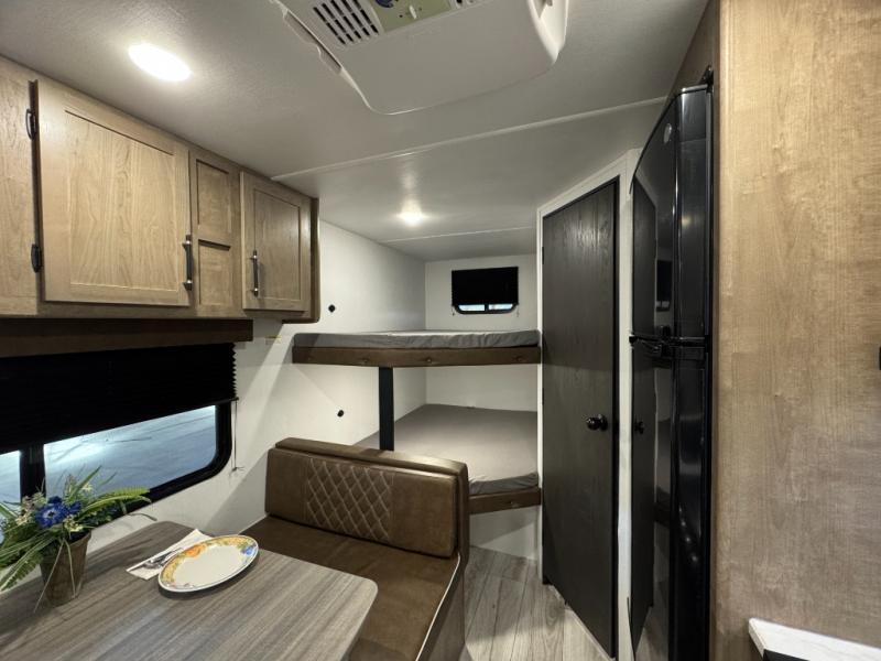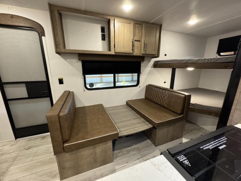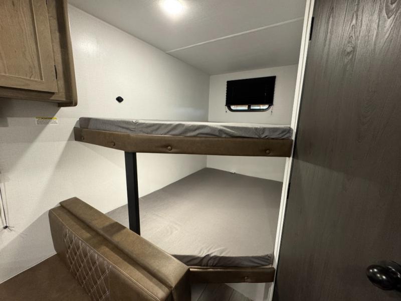 Bring the whole gang and explore with this bunkhouse travel trailer in tow! There is sleeping for up to 10 with double-size bunk beds, a queen bed up front, as well as a sofa and booth dinette that can accommodate more when reconfigured at night. You will easily be able to create meals to enjoy while camping inside with the three-burner range and a 10 cu. ft. 12V refrigerator. Overhead storage is available above the stove and sink and along the opposite side. There is also a front pass-through for housing all of your outdoor gear, as well as additional outside storage beneath the bunk beds. The 12' power awning will also provide more living space and outdoor protection from the sun and/or rain.