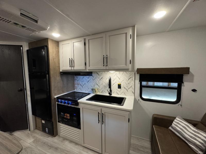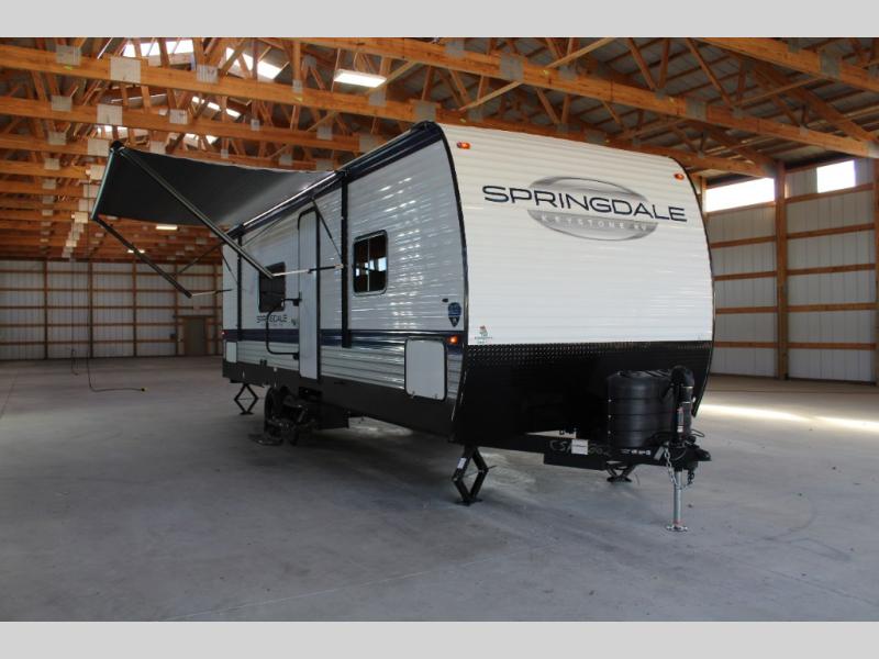 The Springdale Classic travel trailers by Keystone will provide you and your family many great outdoor experiences and it will also be kind to your pocketbook. Each one is constructed with an aluminum exterior, a walkable roof, and an I-beam frame with stamped steel cross-members and outriggers for added strength. There are also electric stabilizer jacks and power tongue jacks outside, along with a friction hinge entry door and an XL entry assist handle for added convenience. Each travel trailer includes a two burner flush mount gas range with a glass cover, LED lighting, bedside outlets, and blackout night shades inside that will provide you with more privacy at night.