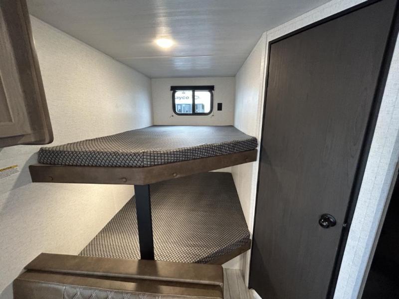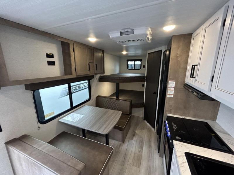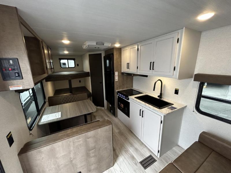 Bring the whole gang and explore with this bunkhouse travel trailer in tow! There is sleeping for up to 10 with double-size bunk beds, a queen bed up front, as well as a sofa and booth dinette that can accommodate more when reconfigured at night. You will easily be able to create meals to enjoy while camping inside with the three-burner range and a 10 cu. ft. 12V refrigerator. Overhead storage is available above the stove and sink and along the opposite side. There is also a front pass-through for housing all of your outdoor gear, as well as additional outside storage beneath the bunk beds. The 12' power awning will also provide more living space and outdoor protection from the sun and/or rain.