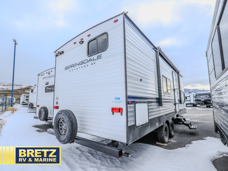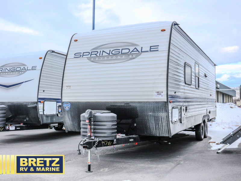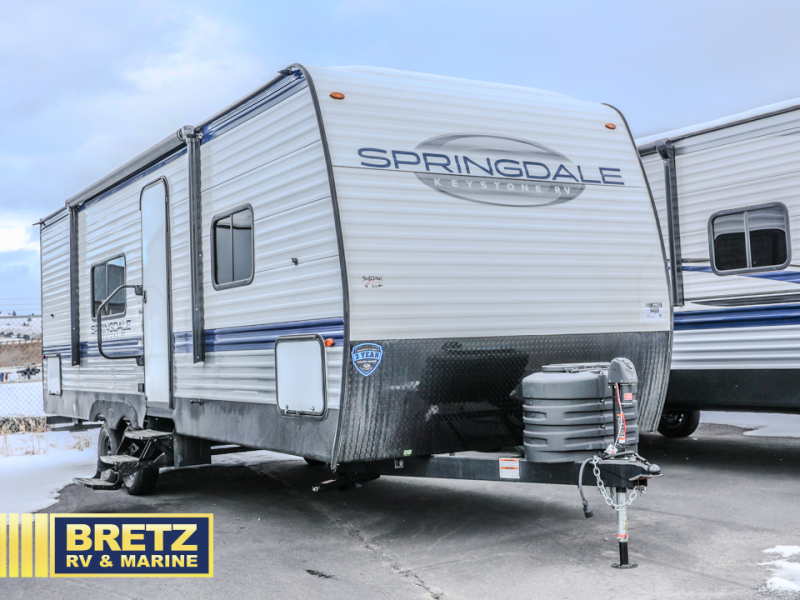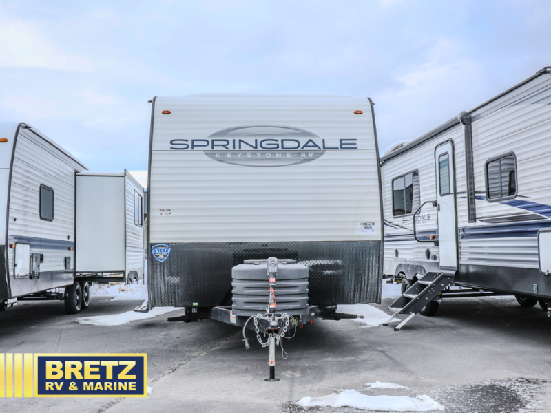 The Springdale Classic travel trailers by Keystone will provide you and your family many great outdoor experiences and it will also be kind to your pocketbook. Each one is constructed with an aluminum exterior, a walkable roof, and an I-beam frame with stamped steel cross-members and outriggers for added strength. There are also electric stabilizer jacks and power tongue jacks outside, along with a friction hinge entry door and an XL entry assist handle for added convenience. Each travel trailer includes a two burner flush mount gas range with a glass cover, LED lighting, bedside outlets, and blackout night shades inside that will provide you with more privacy at night. Some of the Keystone Exclusives you'll appreciate are the color-coded unified wiring and in-floor heating ducts, and the optional SolarFlex 200 will let you add off-grid capabilities if you choose!