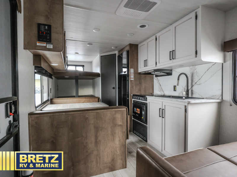 Bring the whole gang and explore with this bunkhouse travel trailer in tow! There is sleeping for up to 10 with double-size bunk beds, a queen bed up front, as well as a sofa and booth dinette that can accommodate more when reconfigured at night. You will easily be able to create meals to enjoy while camping inside with the cooktop and 10 cu. ft. 12V refrigerator. Overhead storage is available above the stove and sink and along the opposite side. There is also a front pass-through for housing all of your outdoor gear, as well as additional outside storage beneath the bunk beds. The 12' power awning will also provide more living space and outdoor protection from the sun and/or rain.