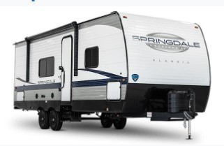 The Springdale Classic travel trailers by Keystone will provide you and your family many great outdoor experiences and it will also be kind to your pocketbook. Each one is constructed with an aluminum exterior, a walkable roof, and an I-beam frame with stamped steel cross-members and outriggers for added strength. There are also electric stabilizer jacks and power tongue jacks outside, along with a friction hinge entry door and an XL entry assist handle for added convenience. Each travel trailer includes a two burner flush mount gas range with a glass cover, LED lighting, bedside outlets, and blackout night shades inside that will provide you with more privacy at night.