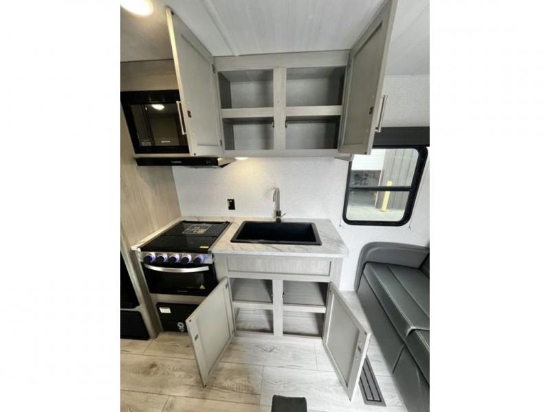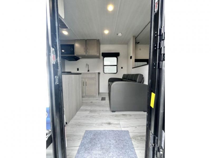 Bring the whole gang and explore with this bunkhouse travel trailer in tow! There is sleeping for up to 10 with double-size bunk beds, a queen bed up front, as well as a sofa and booth dinette that can accommodate more when reconfigured at night. You will easily be able to create meals to enjoy while camping inside with the cooktop and 10 cu. ft. 12V refrigerator. Overhead storage is available above the stove and sink and along the opposite side. There is also a front pass-through for housing all of your outdoor gear, as well as additional outside storage beneath the bunk beds. The 12' power awning will also provide more living space and outdoor protection from the sun and/or rain.