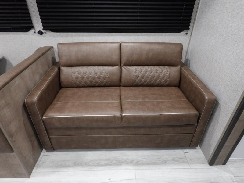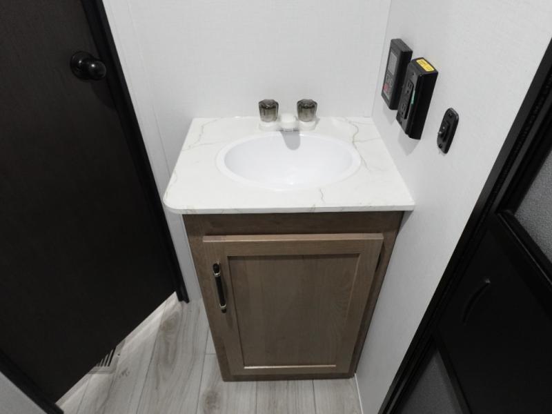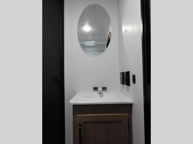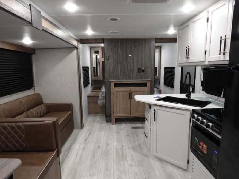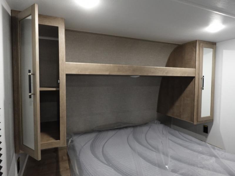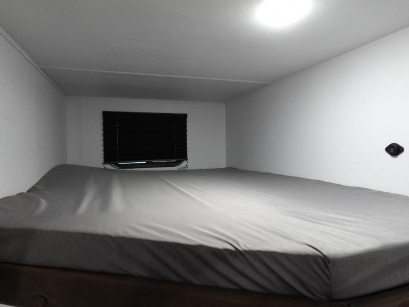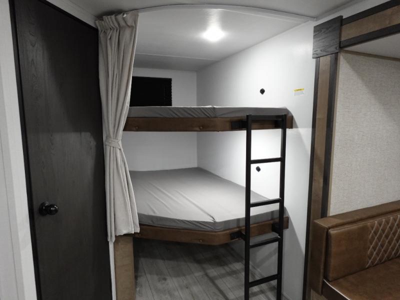 You'll have additional space to stretch out in this travel trailer for eight to ten! Within the super slide you'll find the booth dinette and sofa that will be perfect for meal times, relaxing, and sleeping more guests, and there is an entertainment with TV prep for movie nights. The little ones will love the double-size bunks, and the full bath is close by for easy nighttime use. You'll have the front private bedroom with a queen bed all to yourselves, plus there are dual closets and nightstands for your things. This model also includes an exterior pass-through storage outside and a 16' power awning for protection against the sun!