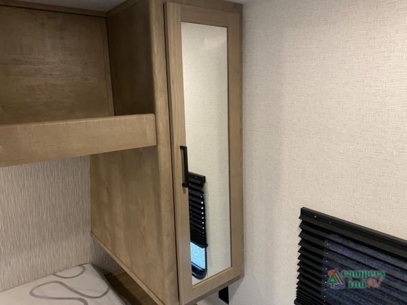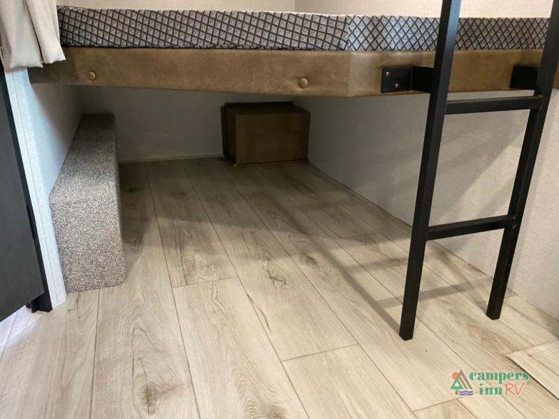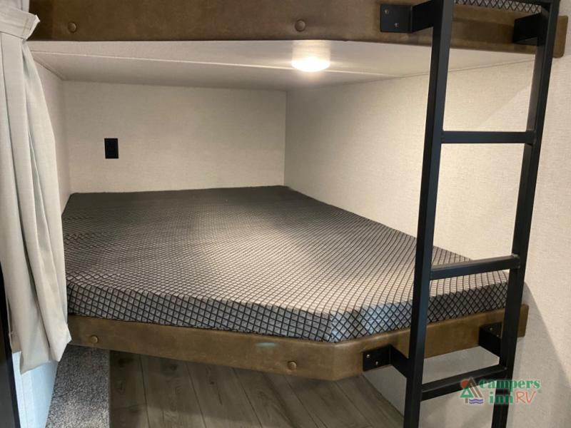 You'll have additional space to stretch out in this travel trailer for eight to ten! Within the super slide you'll find the booth dinette and sofa that will be perfect for meal times, relaxing, and sleeping more guests, and there is an entertainment with TV prep for movie nights. The little ones will love the double-size bunks, and the full bath is close by for easy nighttime use. You'll have the front private bedroom with a queen bed all to yourselves, plus there are dual closets and nightstands for your things. This model also includes an exterior pass-through storage outside and a 16' power awning for protection against the sun!