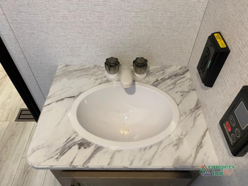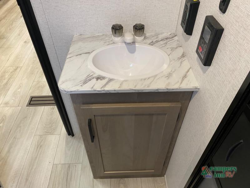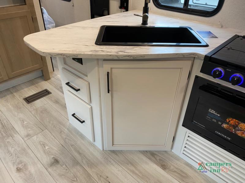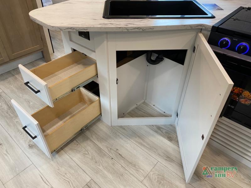 Kitchen: Boasts a 10 cu. ft. 12V refrigerator, 3-burner gas range with glass cover, air fryer microwave, and a high-rise faucet.