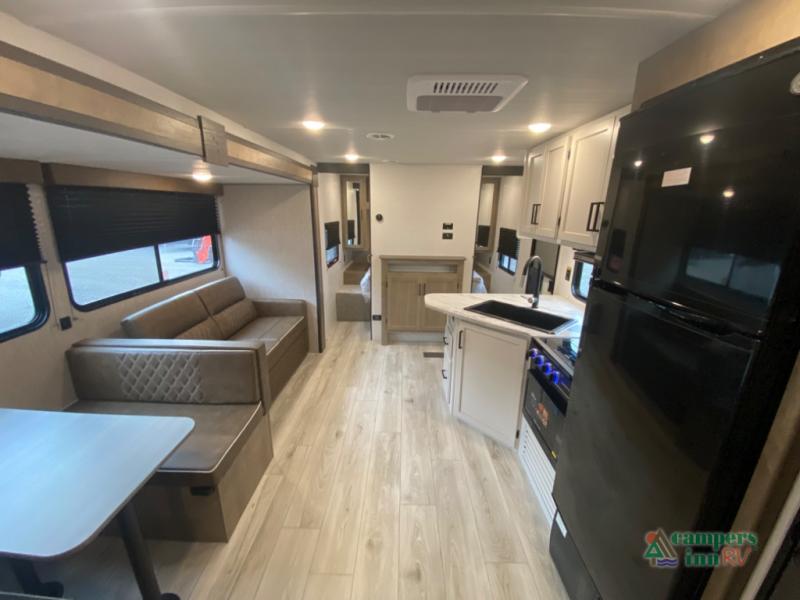 Living Space: Equipped with a super slide-out that expands the living area, featuring a booth dinette and sofa for dining and relaxation.