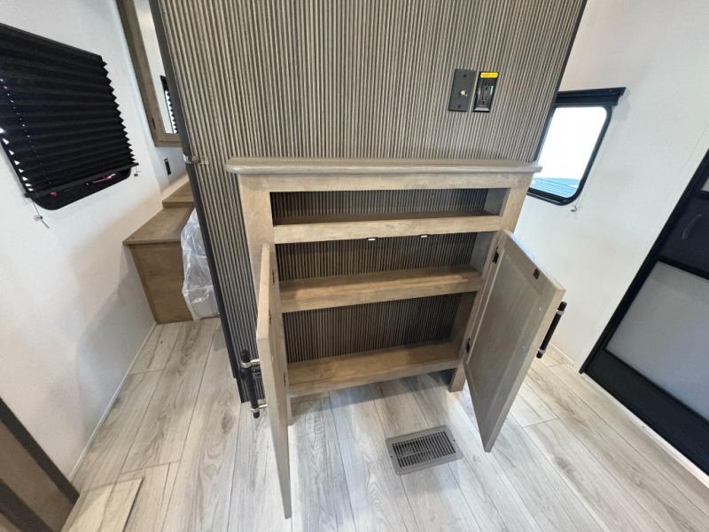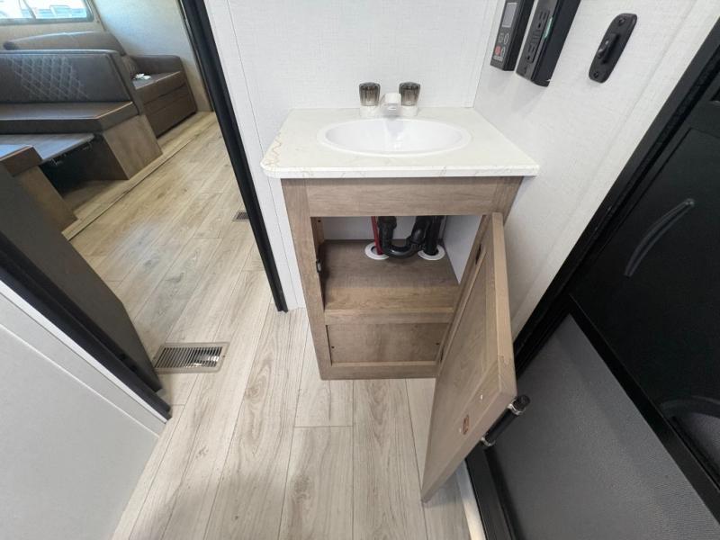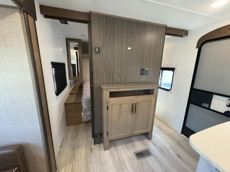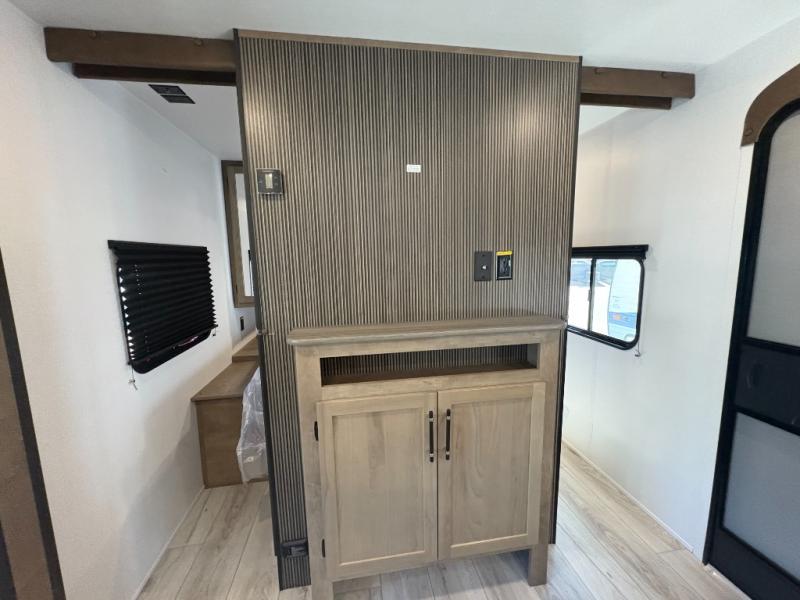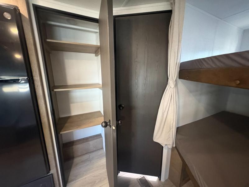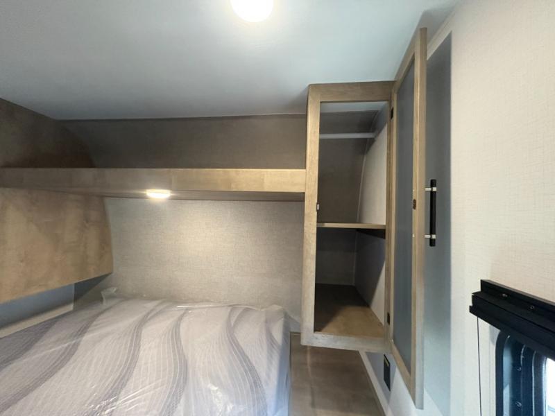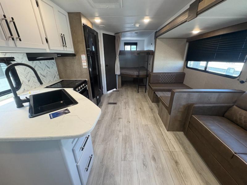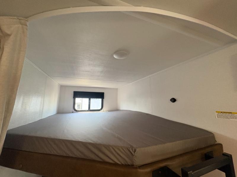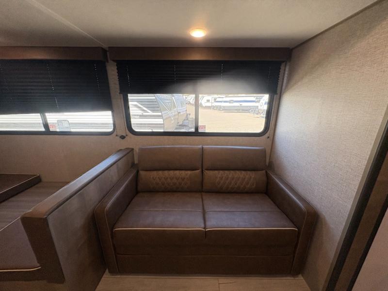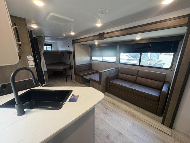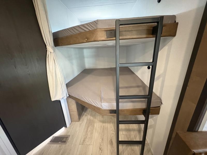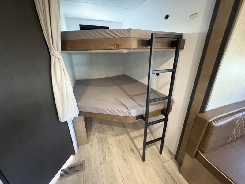 You'll have additional space to stretch out in this travel trailer for eight to ten! Within the super slide you'll find the booth dinette and sofa that will be perfect for meal times, relaxing, and sleeping more guests, and there is an entertainment with TV prep for movie nights. The little ones will love the double-size bunks, and the full bath is close by for easy nighttime use. You'll have the front private bedroom with a queen bed all to yourselves, plus there are dual closets and nightstands for your things. This model also includes an exterior pass-through storage outside and a 16' power awning for protection against the sun!