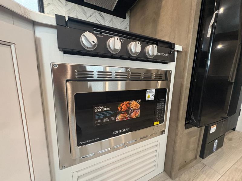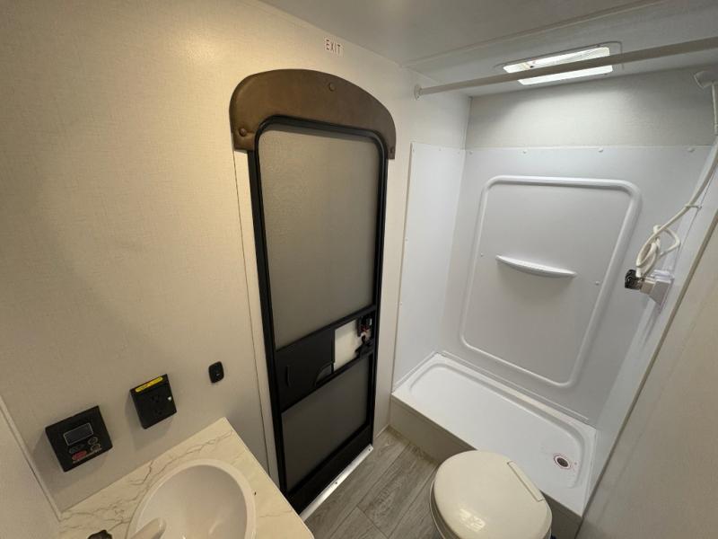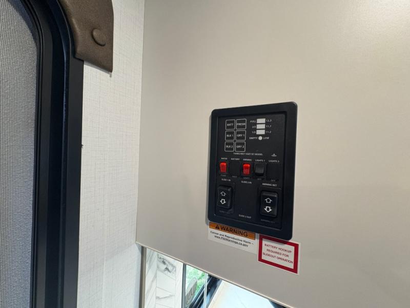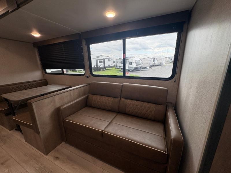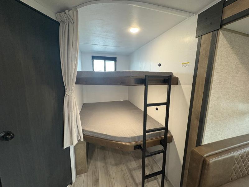You'll have additional space to stretch out in this travel trailer for eight to ten! Within the slide you'll find the booth dinette and sofa that will be perfect for meal times, relaxing, and sleeping more guests, and there is an entertainment with TV prep for movie nights. The little ones will love the double-size bunks, and the full bath is close by for easy nighttime use. You'll have the front private bedroom with a queen bed all to yourselves, plus there are dual closets and nightstands for your things. This model also includes an exterior pass-through storage outside and a 16' power awning for protection against the sun!