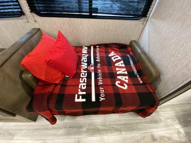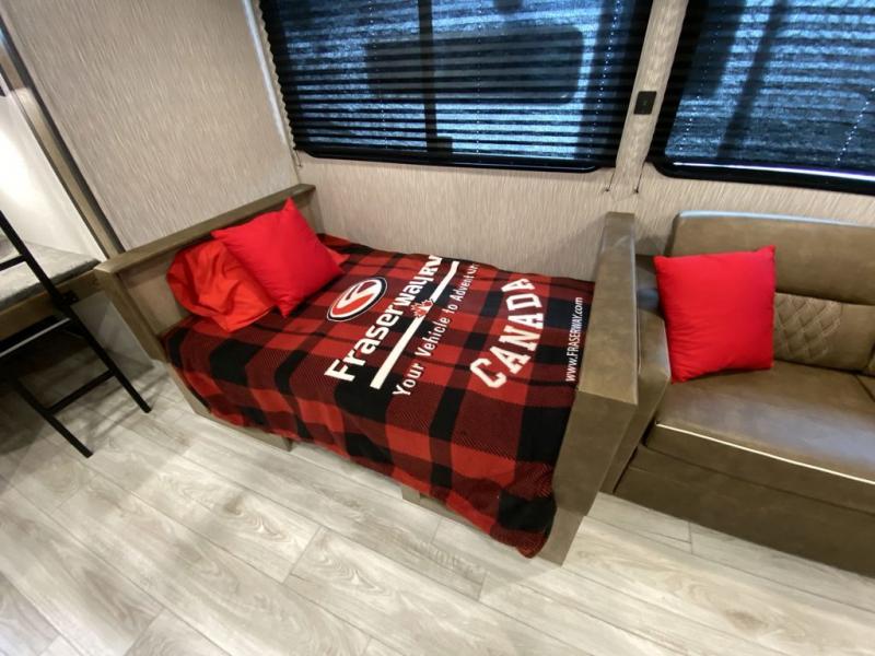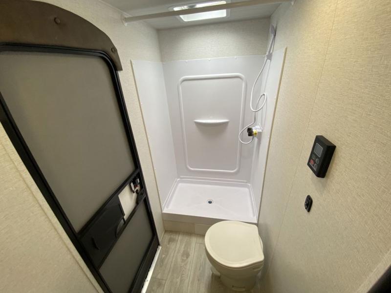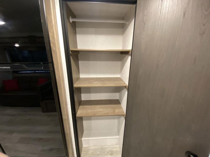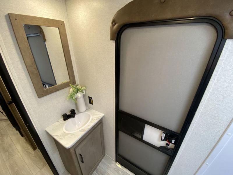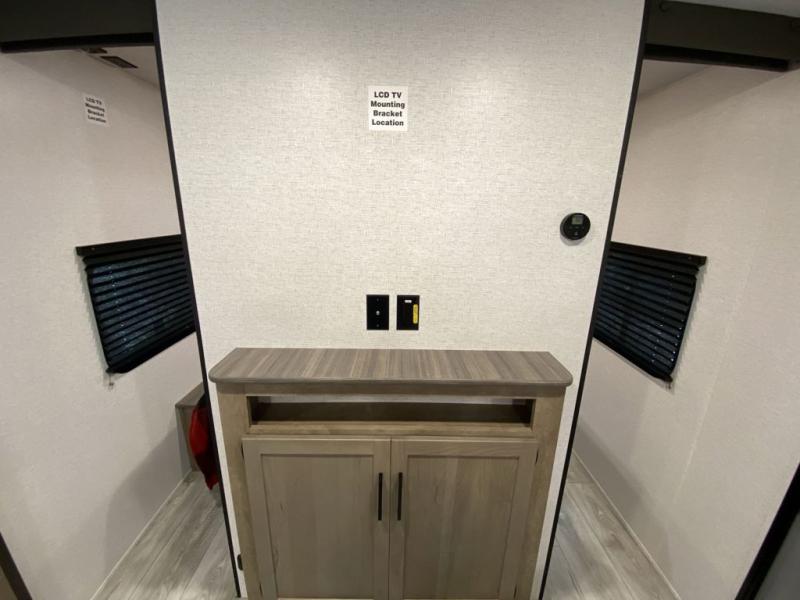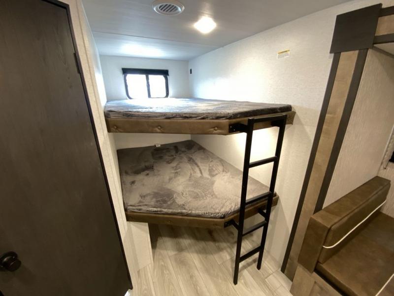 You'll have additional space to stretch out in this travel trailer for eight to ten! Within the super slide you'll find the booth dinette and sofa that will be perfect for meal times, relaxing, and sleeping more guests, and there is an entertainment with TV prep for movie nights. The little ones will love the double-size bunks, and the full bath is close by for easy nighttime use. You'll have the front private bedroom with a queen bed all to yourselves, plus there are dual closets and nightstands for your things. This model also includes an exterior pass-through storage outside and a 16' power awning for protection against the sun!