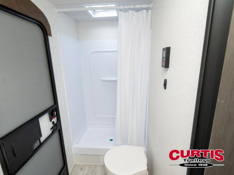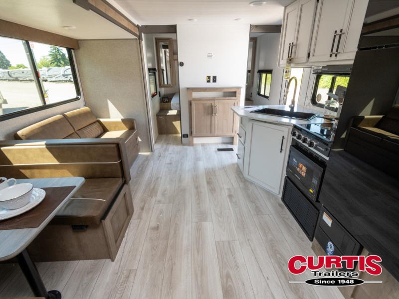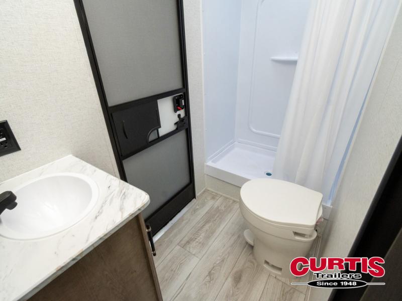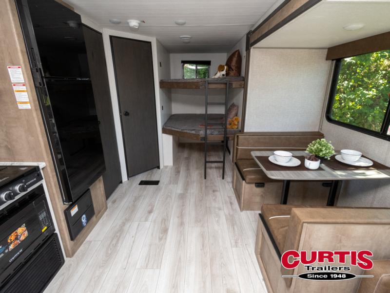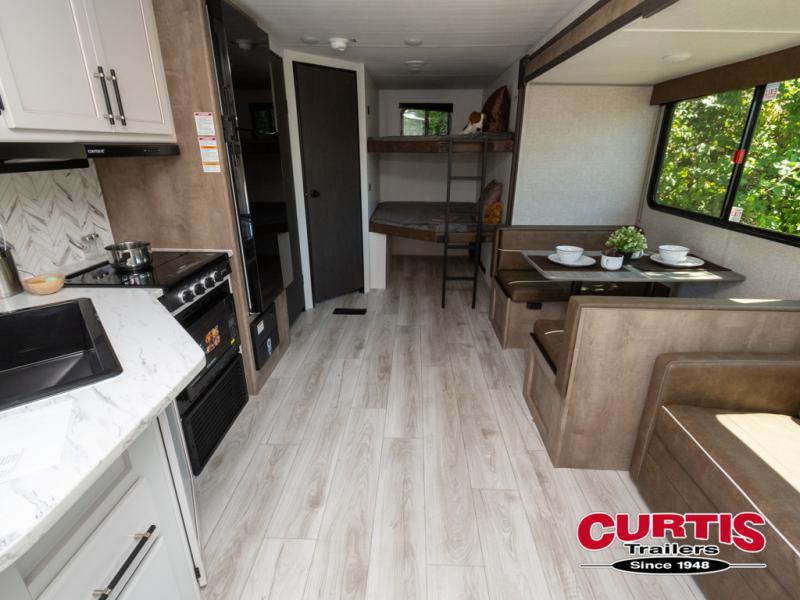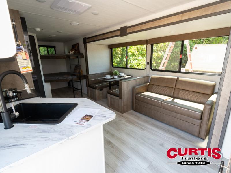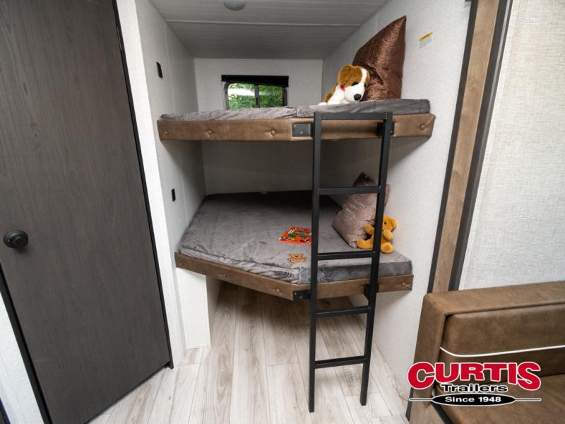 You'll have additional space to stretch out in this travel trailer for eight to ten! Within the super slide you'll find the booth dinette and sofa that will be perfect for meal times, relaxing, and sleeping more guests, and there is an entertainment with TV prep for movie nights. The little ones will love the double-size bunks, and the full bath is close by for easy nighttime use. You'll have the front private bedroom with a queen bed all to yourselves, plus there are dual closets and nightstands for your things. This model also includes an exterior pass-through storage outside and a 16' power awning for protection against the sun!