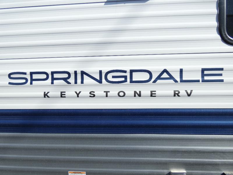 The Springdale Classic travel trailers by Keystone will provide you and your family many great outdoor experiences and it will also be kind to your pocketbook. Each one is constructed with an aluminum exterior, a walkable roof, and an I-beam frame with stamped steel cross-members and outriggers for added strength. There are also electric stabilizer jacks and power tongue jacks outside, along with a friction hinge entry door and an XL entry assist handle for added convenience. Each travel trailer includes a two burner flush mount gas range with a glass cover, LED lighting, bedside outlets, and blackout night shades inside that will provide you with more privacy at night. Some of the Keystone Exclusives you'll appreciate are the color-coded unified wiring and in-floor heating ducts.