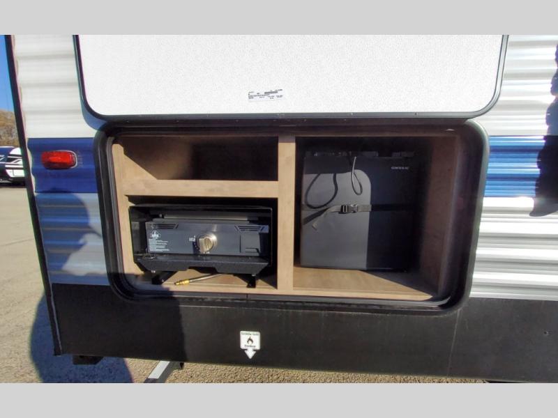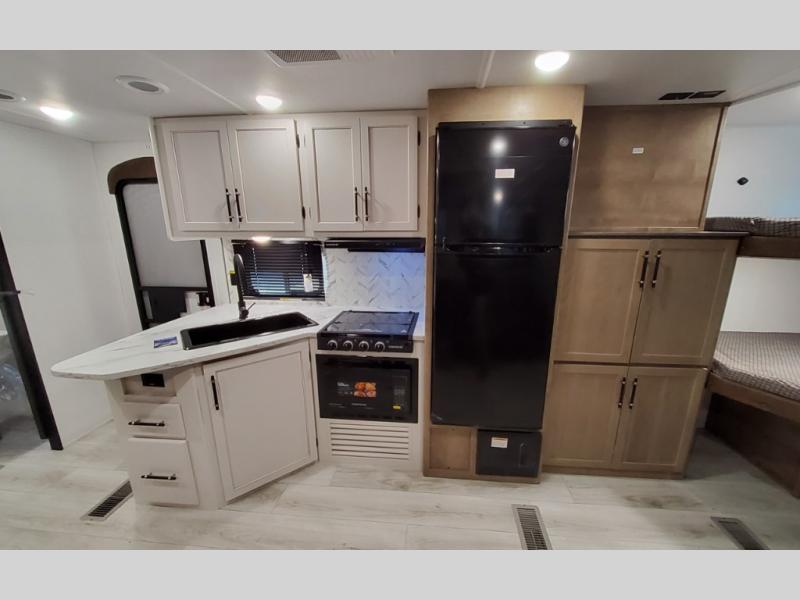 What could be better than camping with double-size bunks for guests? How about a front private bedroom for you, a full bath to clean up in, and a super slide out for maximum space! The chef of your group can prepare breakfast on the three burner gas range in the morning, or use the microwave if you're on the go. There is a booth dinette to dine at, or you can take your plate outdoors to sit under the power awning.