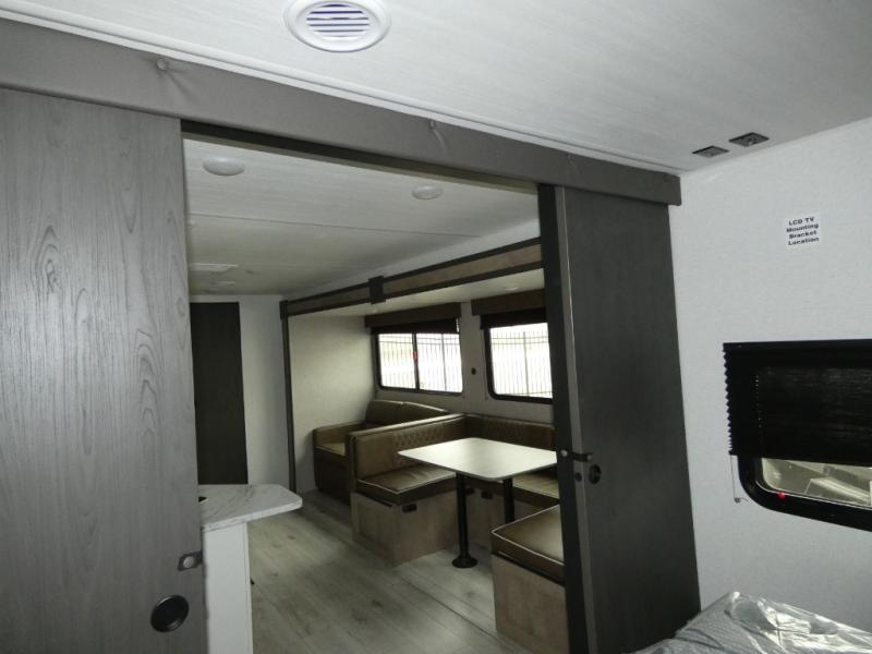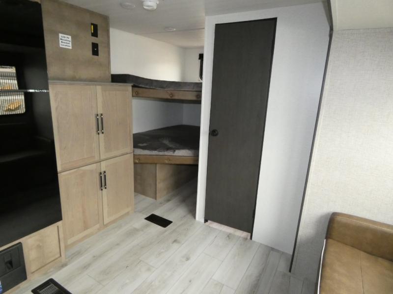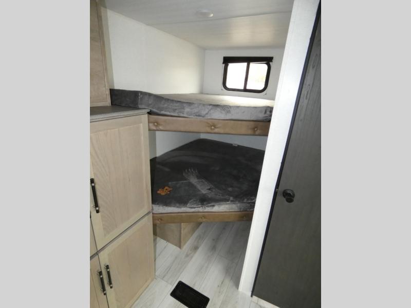 What could be better than camping with double-size bunks for guests? How about a front private bedroom for you, a full bath to clean up in, and a super slide out for maximum space! The chef of your group can prepare breakfast on the three burner gas range in the morning, or use the microwave if you're on the go. There is a booth dinette to dine at, or you can take your plate outdoors to sit under the power awning.