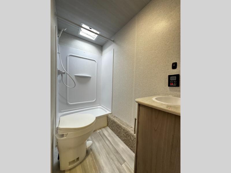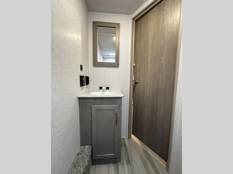 The spacious bathroom with tub/shower combo, vanity sink, and mirrored medicine cabinet ensures everyone stays clean and comfortable — even off-grid.