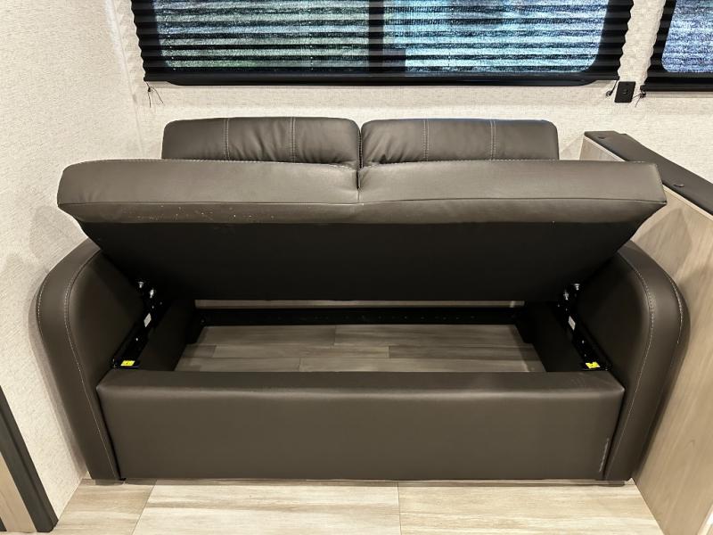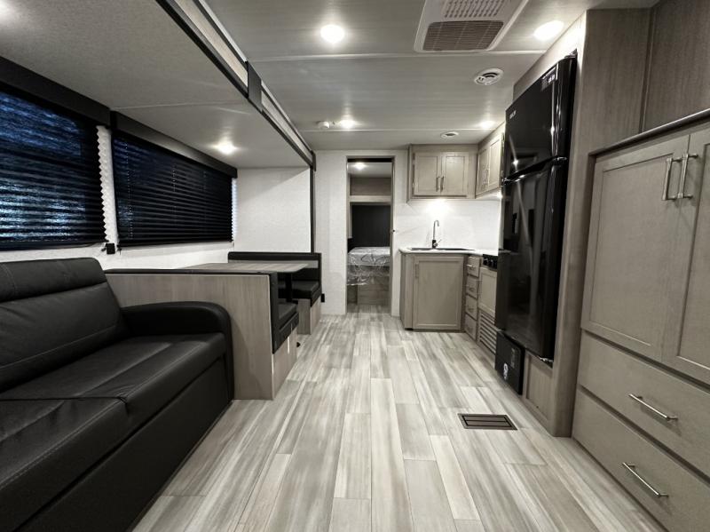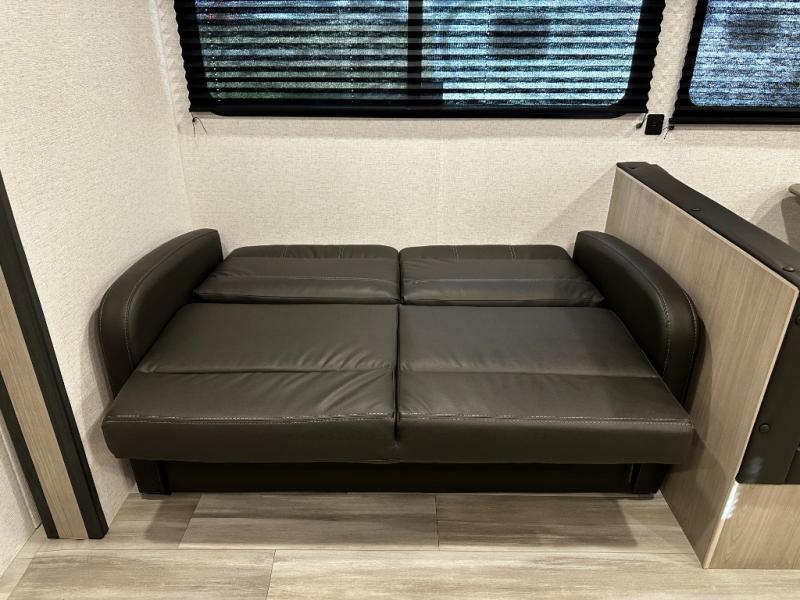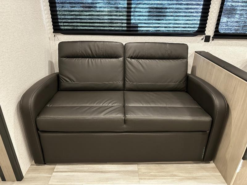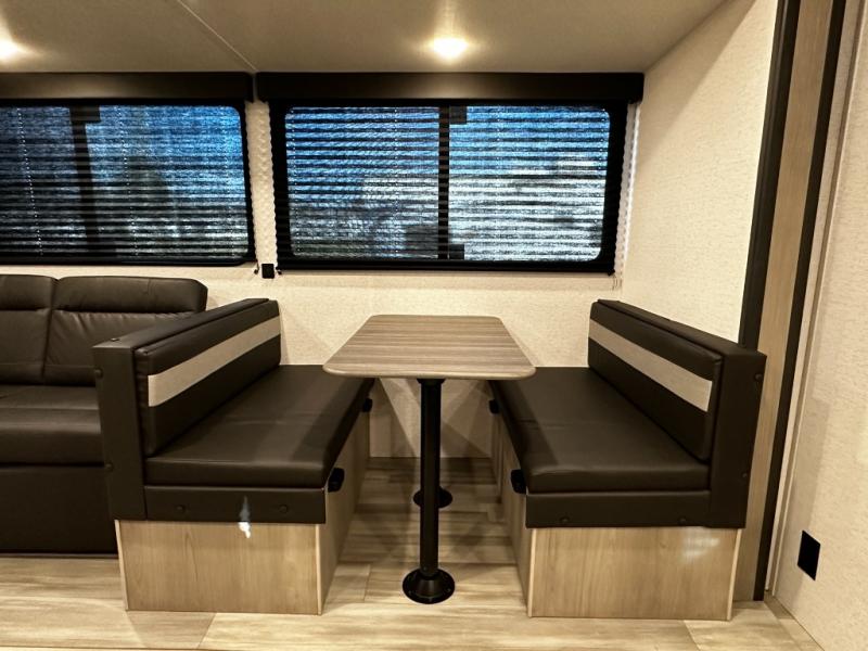 Enjoy the roomy feel of the large slide-out featuring a comfortable booth dinette and jackknife sofa — ideal for dining, lounging, and family game nights after a day of outdoor fun.