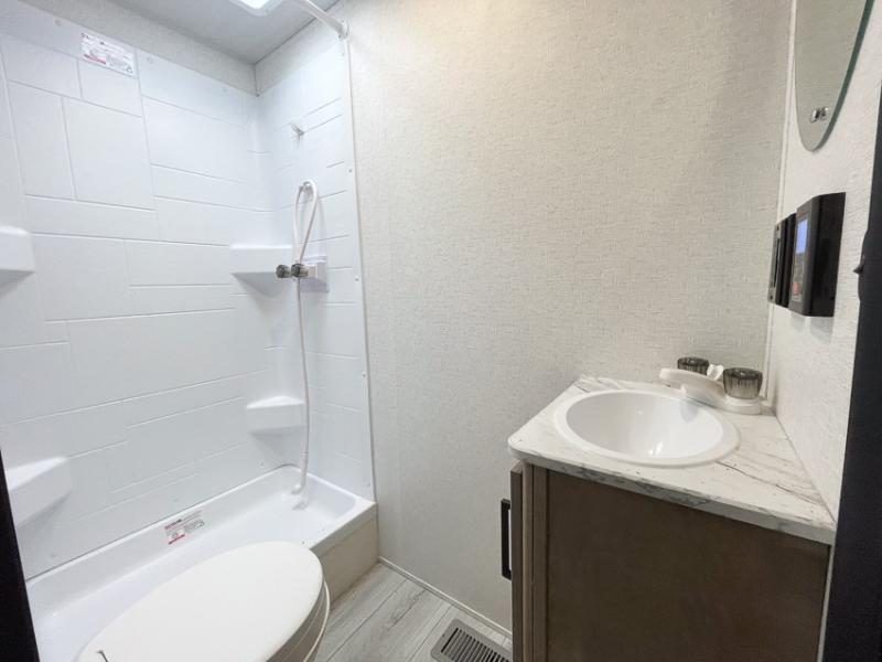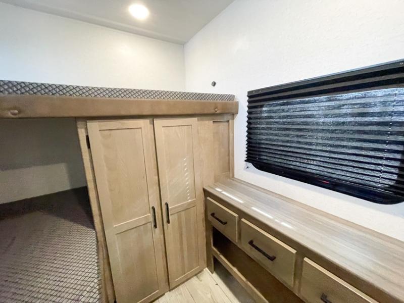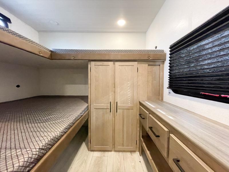 Camping with friends and family is easier than ever in this spacious trailer with a rear private bunkhouse! You'll find triple bunks in this room, along with two closets to keep everything tidy. The front private bedroom will feel just like home with its queen bed, plus dual closets and dual nightstands. Your crew can all gather in the main living area to relax on the sofa or play a game at the booth dinette, and there is even TV prep in this room if you enjoy movie nights. Head outdoors to relax under the 16' power awning, and since there is outdoor refrigerator prep, you can add a refrigerator for cold drinks!