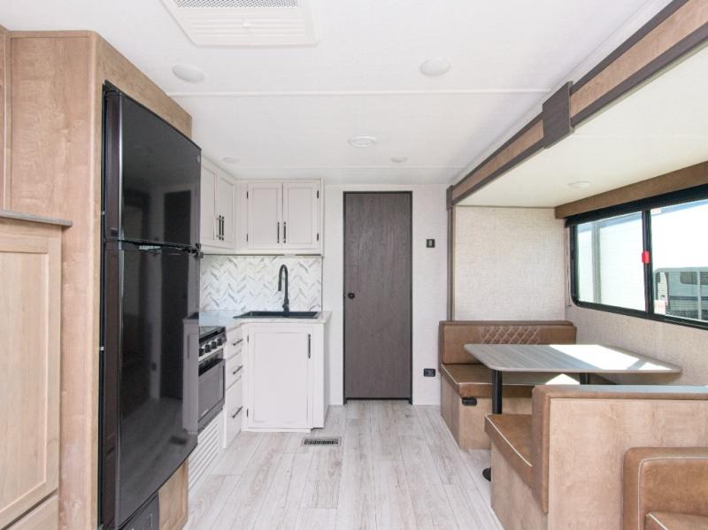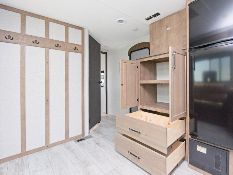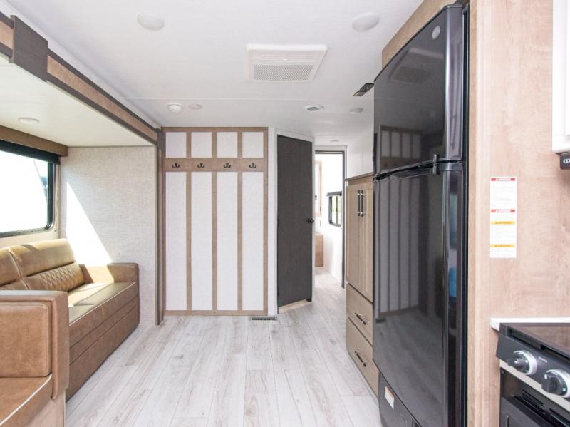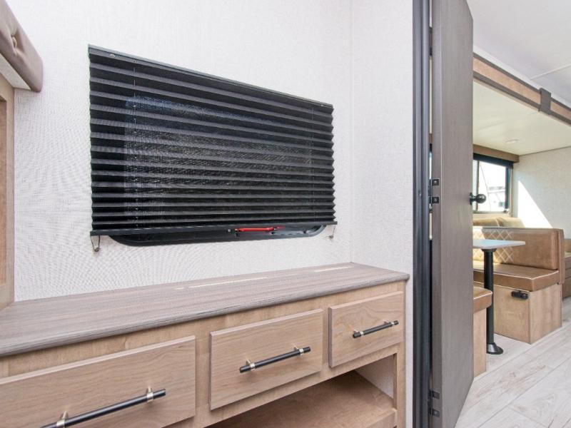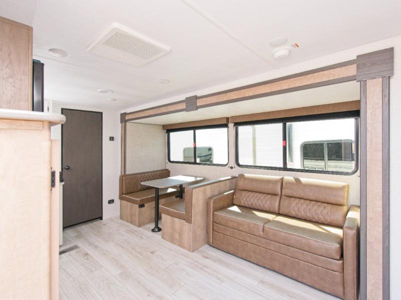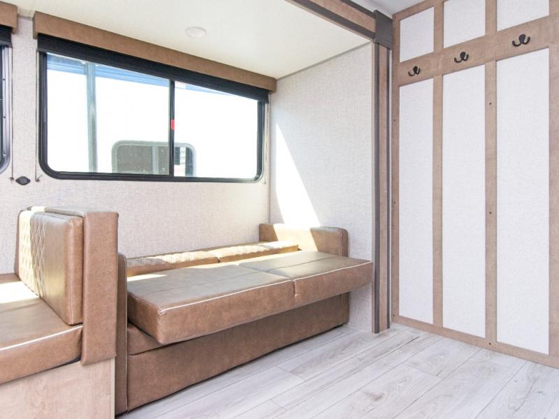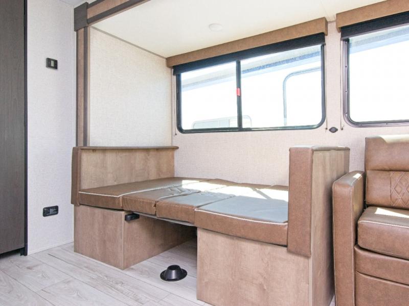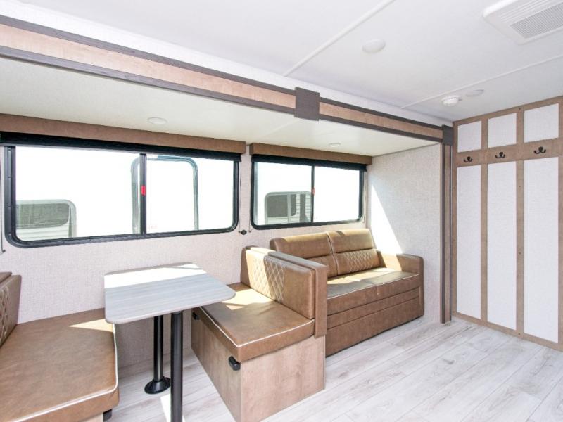 In the spacious main living area, relax on the sofa or enjoy family meals at the booth dinette, with TV prep for movie nights. When you're ready to unwind outdoors, the 16' power awning provides the perfect space for relaxation, and with outdoor refrigerator prep, you can easily add a fridge for cold drinks and snacks.