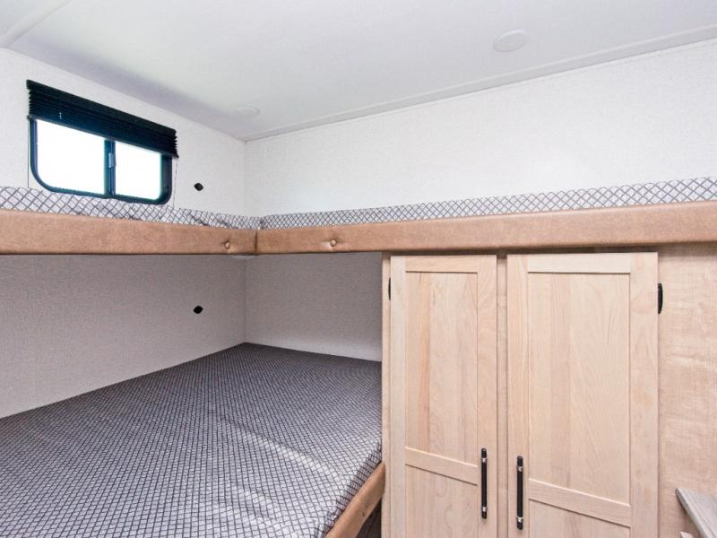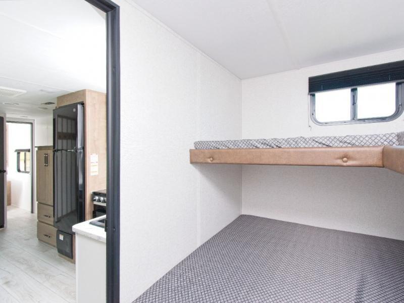 The Keystone Springdale Classic 291BRC offers a private queen bed suite for restful nights and a spacious rear bunkhouse with triple bunks, perfect for family camping adventures.