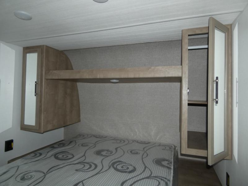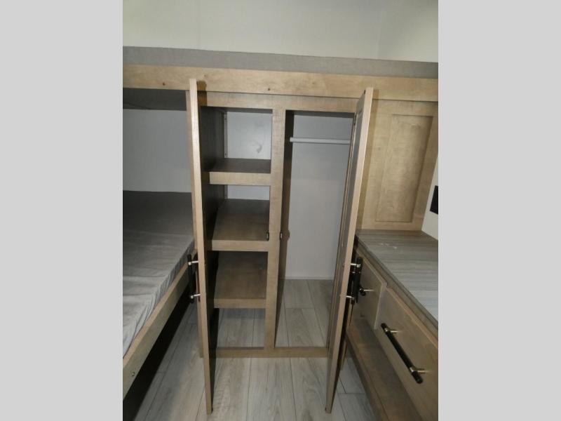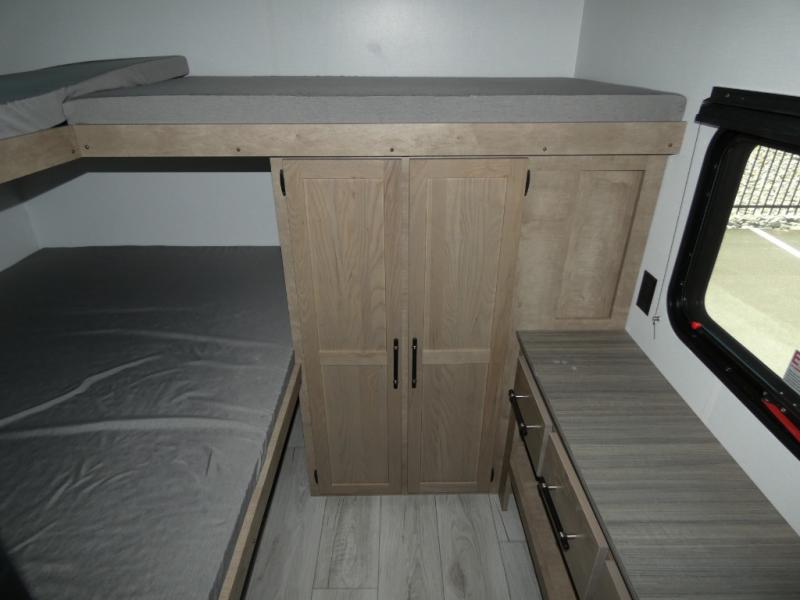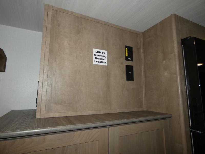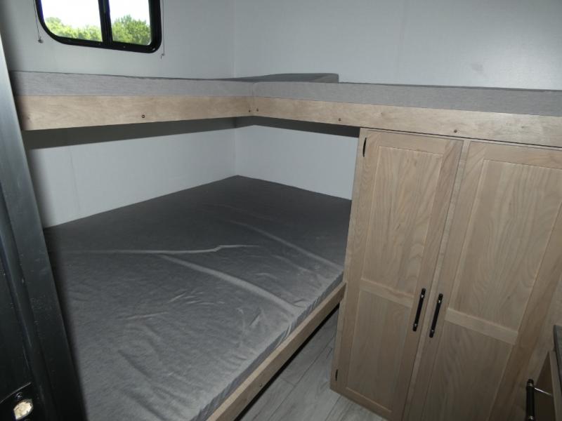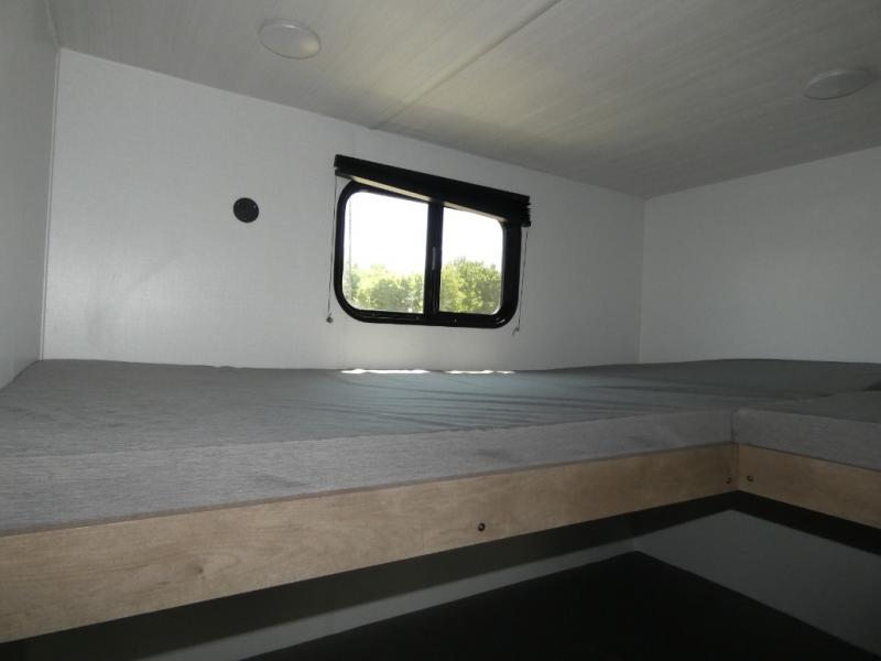 Camping with friends and family is easier than ever in this spacious trailer with a rear private bunkhouse! You'll find triple bunks in this room, along with two closets to keep everything tidy. The front private bedroom will feel just like home with its queen bed, plus dual closets and dual nightstands. Your crew can all gather in the main living area to relax on the sofa or play a game at the booth dinette, and there is even TV prep in this room if you enjoy movie nights. Head outdoors to relax under the 16' power awning.