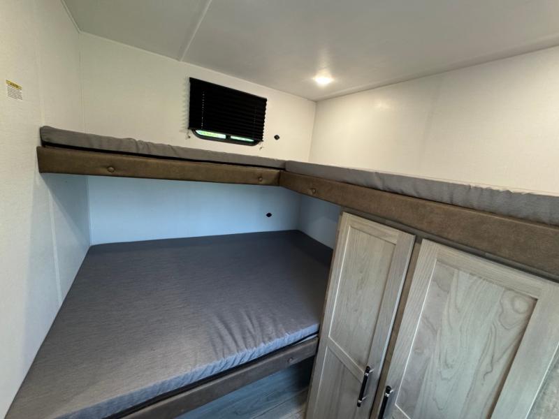 Camping with friends and family is easier than ever in this spacious trailer with a rear private bunkhouse! You'll find triple bunks in this room, along with two closets to keep everything tidy. The front private bedroom will feel just like home with its queen bed, plus dual closets and dual nightstands. Your crew can all gather in the main living area to relax on the sofa or play a game at the booth dinette, and there is even TV prep in this room if you enjoy movie nights. Head outdoors to relax under the 16' power awning.