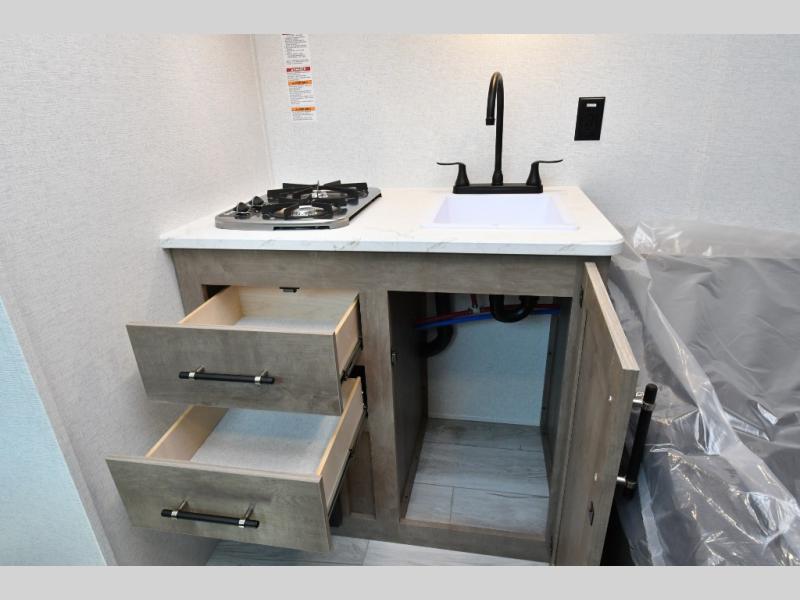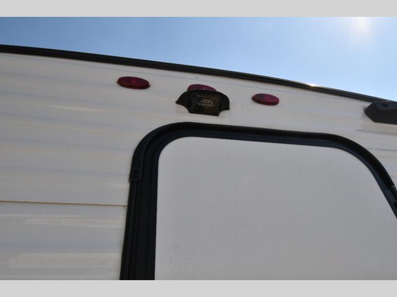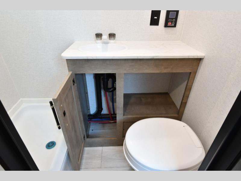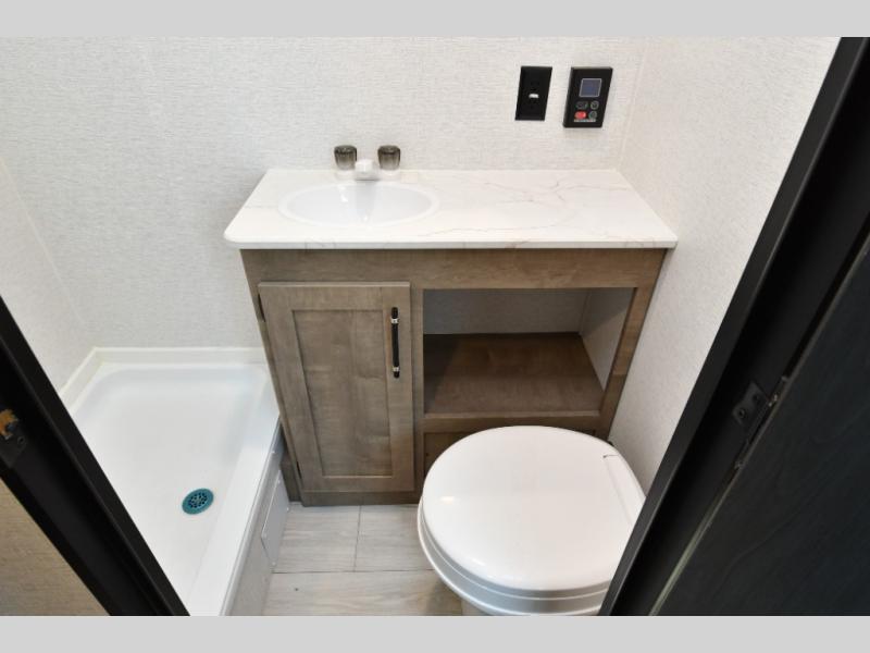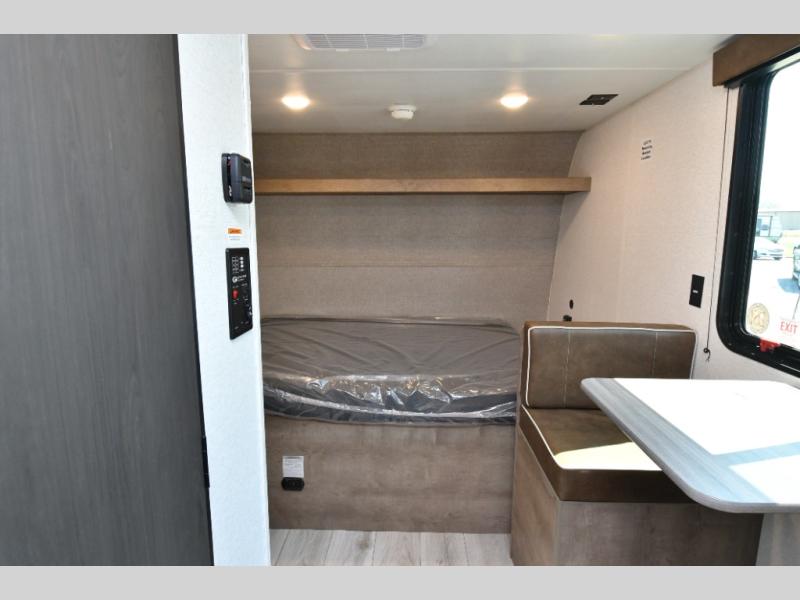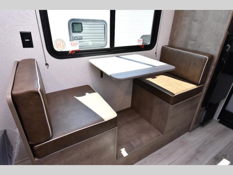 Inside, the front queen bed with overhead storage and bedside convenience provides a comfortable place to unwind after a day of adventure. The kitchen is equipped with a two-burner cooktop and 12V refrigerator, making it easy to prepare meals on the go, while the full bathroom keeps your camping experience convenient and fully self-contained. LED lighting brightens the space, and smart storage throughout ensures everything has its place. Outside, the 10' power awning creates a shaded outdoor living space, while pass-through storage makes loading gear quick and easy. With added features like roof A/C for comfort, stabilizer jacks for quick setup, and a spare tire kit for peace of mind, this Springdale is ready for the road from day one.
