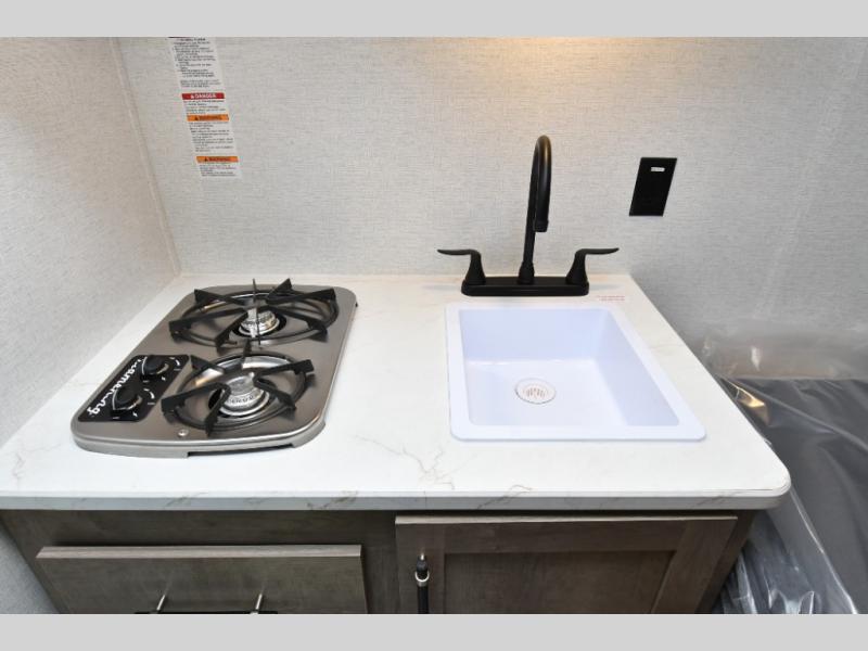 Two-burner cooktop and 12V refrigerator