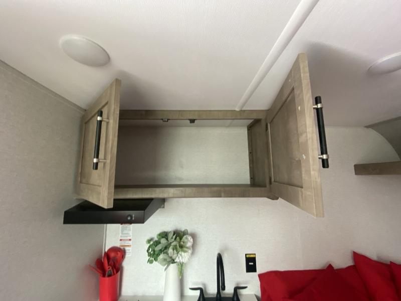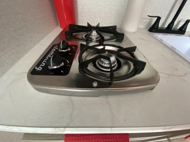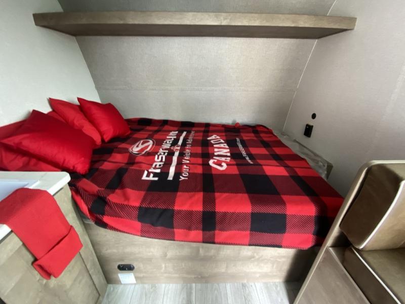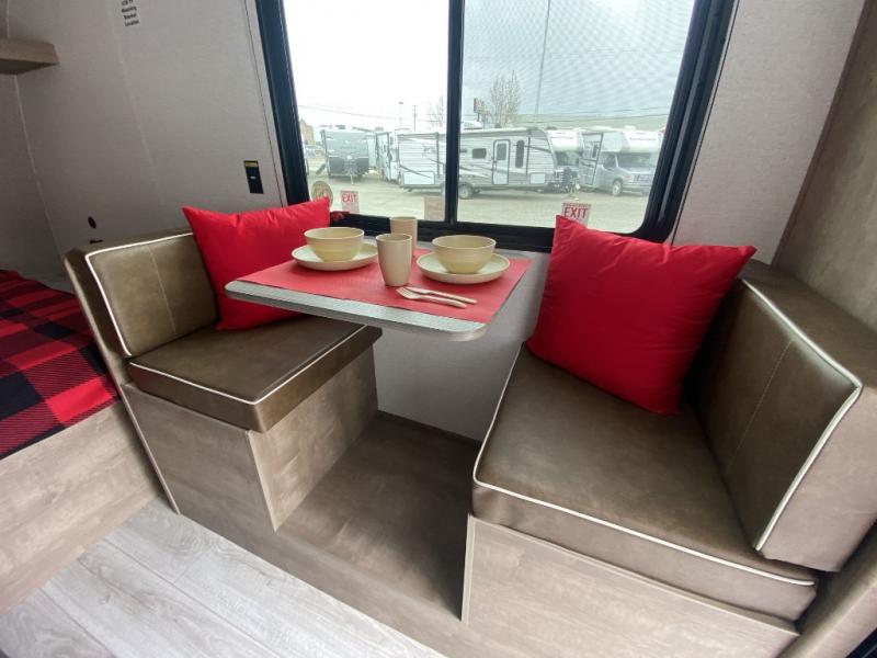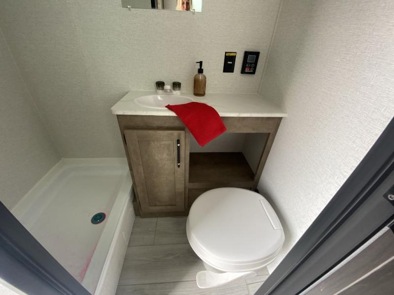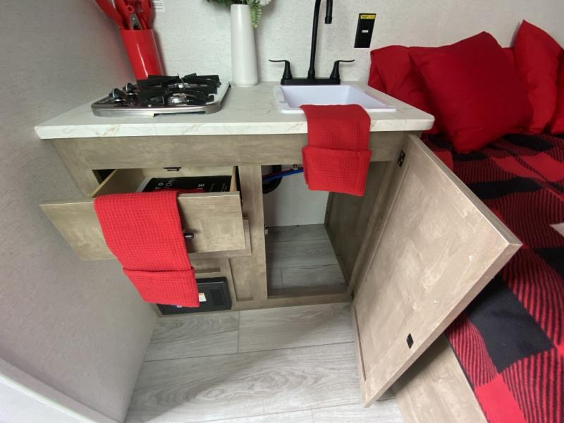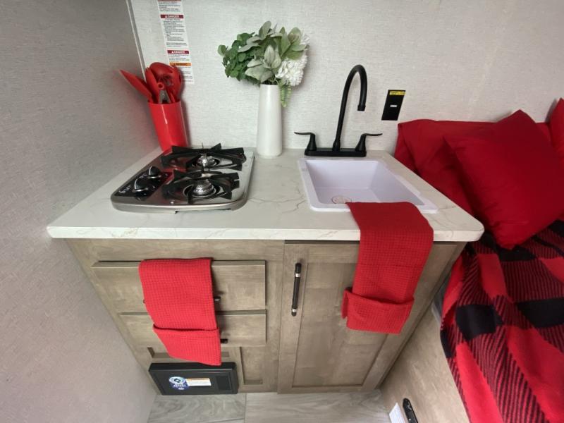 This is the perfect easy-to-tow travel trailer for three campers! The front queen bed includes a shelf above for books plus a closet and nightstand at the foot of the bed for even more storage. You can make meals each day on the two burner gas cooktop and store food in the 3.3 cu. ft. 12V refrigerator. A full bath onboard means you won't have to use the camp's facilities, and the exterior pass-thru storage will be perfect for hiking gear, camp chairs, and more!