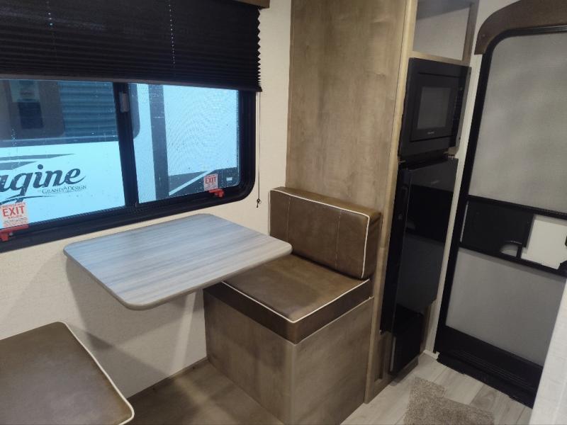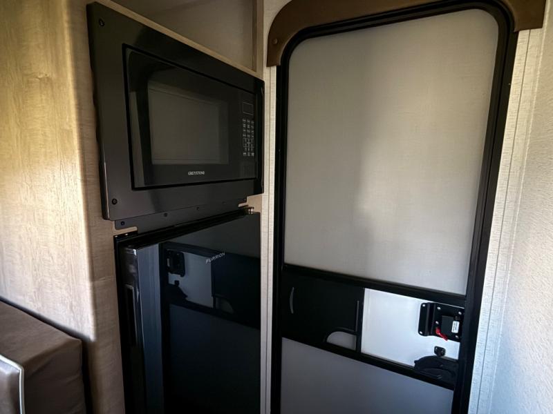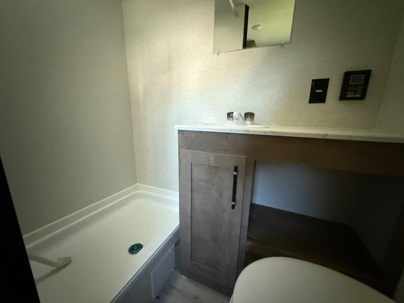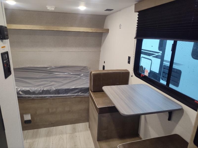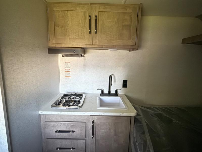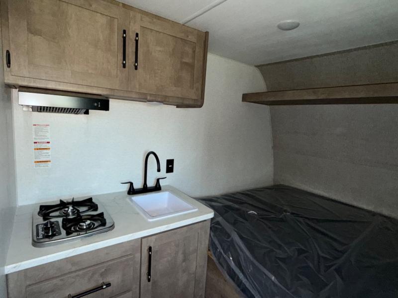 This is the perfect easy-to-tow travel trailer for three campers! The front queen bed includes a shelf above for books plus a closet and nightstand at the foot of the bed for even more storage. You can make meals each day on the two burner gas cooktop and store food in the 3.3 cu. ft. 12V refrigerator. A full bath onboard means you won't have to use the camp's facilities, and the exterior pass-thru storage will be perfect for hiking gear, camp chairs, and more!