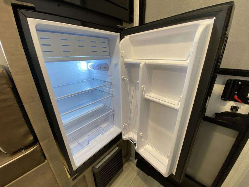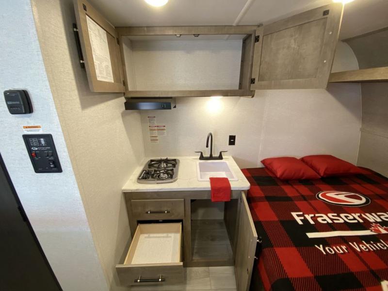 This is the perfect easy-to-tow travel trailer for three campers! The front queen bed includes a shelf above for books plus a closet and nightstand at the foot of the bed for even more storage. You can make meals each day on the two burner gas cooktop and store food in the 3.3 cu. ft. 12V refrigerator. A full bath onboard means you won't have to use the camp's facilities, and the exterior pass-thru storage will be perfect for hiking gear, camp chairs, and more!