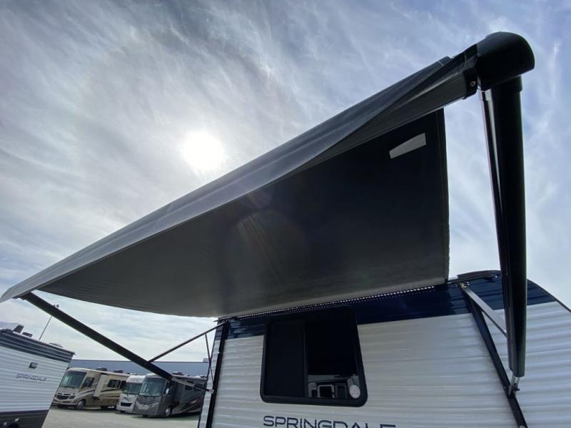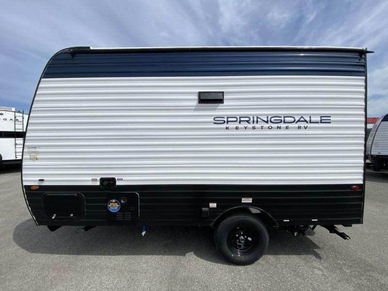 With any Springdale Classic Mini travel trailer by Keystone, you will enjoy lightweight towing thanks to their single-axle! You'll find the XL entry assist handle will make entering and exiting your unit easier than ever, and the power awning will provide protection from the sun as you relax in your camp chairs outside. Each model includes blackout night shades, solid wood cabinet doors and drawers, a shower skylight for more standing room, plus many more interior comforts. There is also a 5,000 BTU sidewall A/C and 20K BTU furnace to keep you comfortable, plus a Girard tankless water heater for endless hot showers!