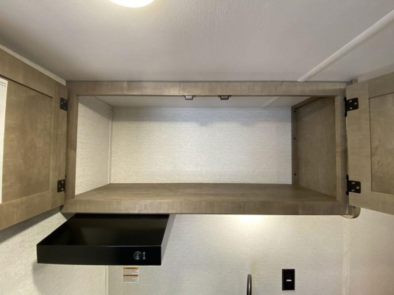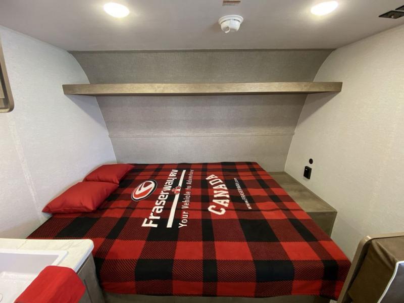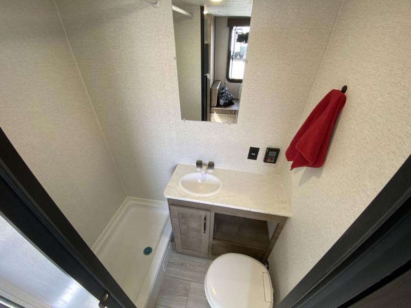 This is the perfect easy-to-tow travel trailer for three campers! The front queen bed includes a shelf above for books plus a closet and nightstand at the foot of the bed for even more storage. You can make meals each day on the two burner gas cooktop and store food in the 3.3 cu. ft. 12V refrigerator. A full bath onboard means you won't have to use the camp's facilities, and the exterior pass-thru storage will be perfect for hiking gear, camp chairs, and more!