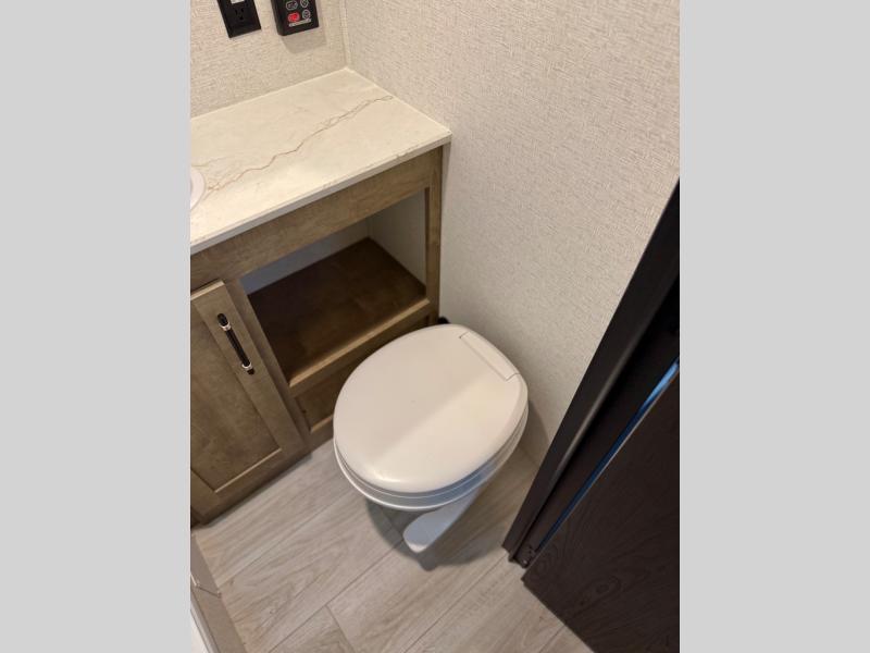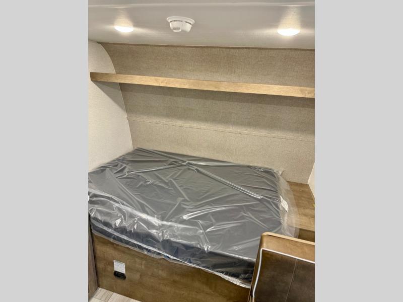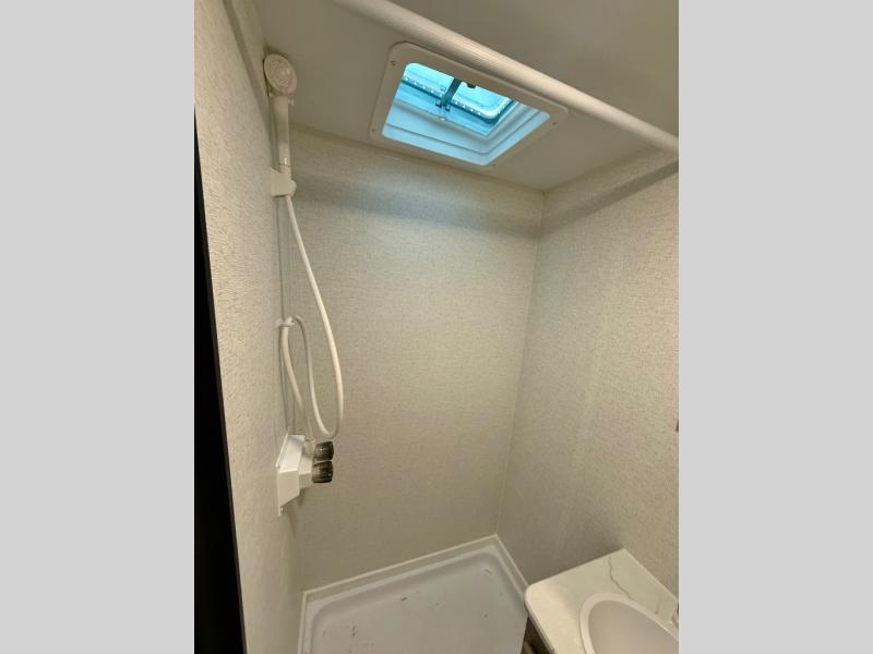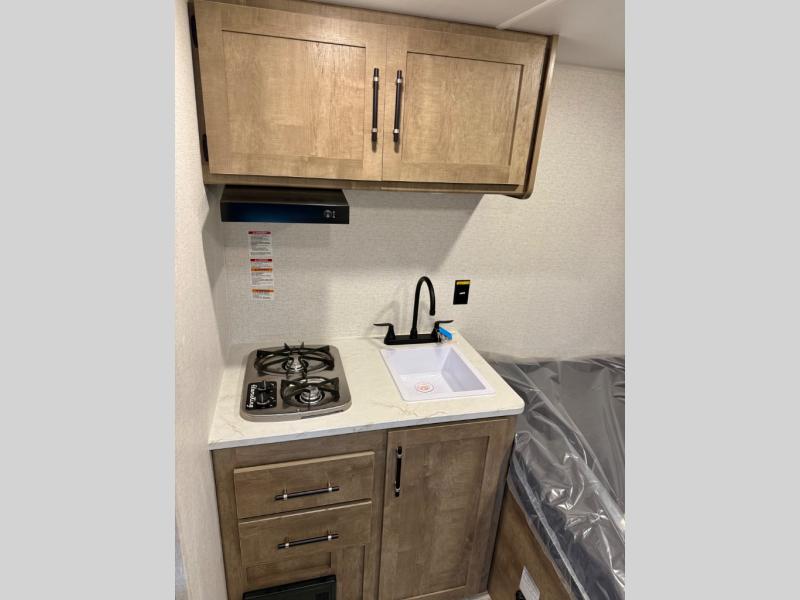 This is the perfect easy-to-tow travel trailer for three campers! The front queen bed includes a shelf above for books plus a closet and nightstand at the foot of the bed for even more storage. You can make meals each day on the two burner gas cooktop and store food in the 3.3 cu. ft. 12V refrigerator. A full bath onboard means you won't have to use the camp's facilities, and the exterior pass-thru storage will be perfect for hiking gear, camp chairs, and more!
