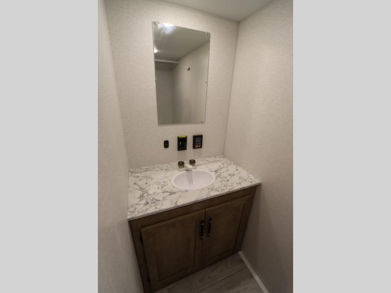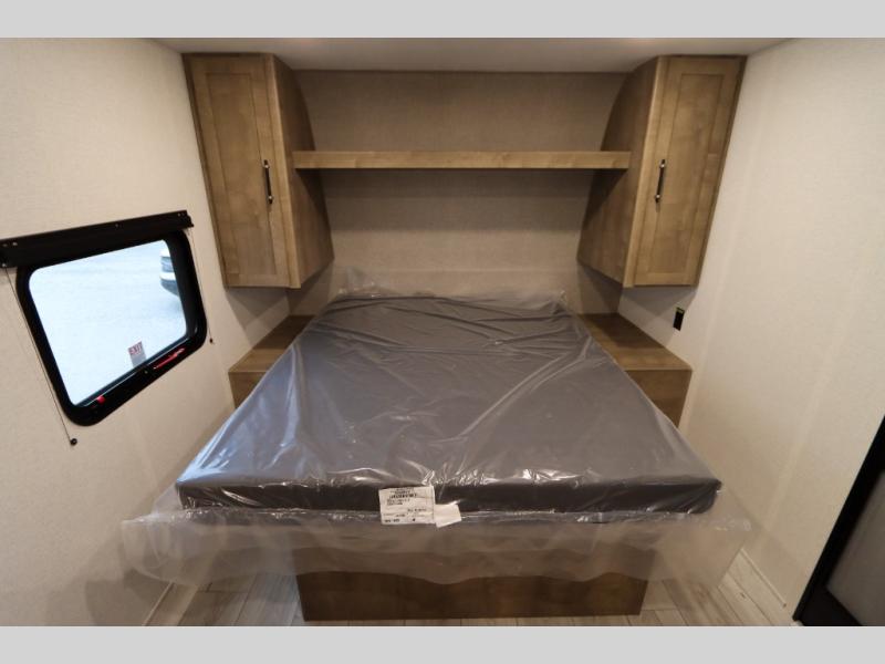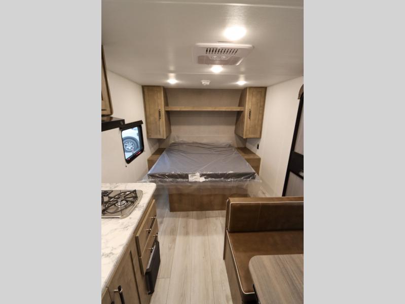 This cozy trailer for two or four will have you out enjoying nature easily. There is a queen bed for you, and the booth dinette can easily transform into a bed for one or two more campers if needed at night. The rear private bath features a shower and vanity with sink, plus toilet so no late night trips to the campground bathroom. There is ample storage in overhead cabinets on both sides of the trailer, as well as dual closets and nightstands on either side of the bed. A 10' awning offers even more living space outside. Grab a couple of camp chairs and enjoy hanging out with your campground neighbors or enjoying a campfire.